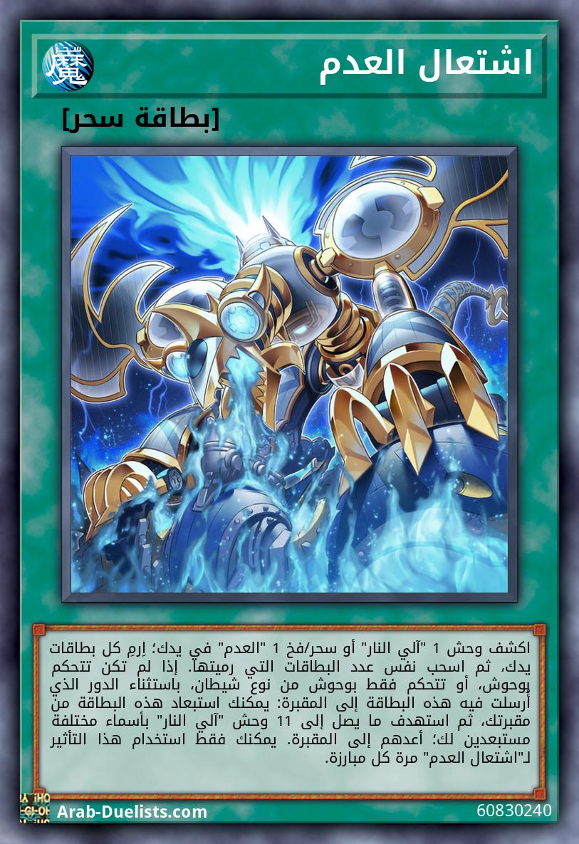 اكشف وحش 1 "آلي النار" أو سحر/فخ 1 "العدم" في يدك؛ اِرمِ كل بطاقات يدك، ثم اسحب نفس عدد البطاقات التي رميتها. إذا لم تكن تتحكم بوحوش، أو تتحكم فقط بوحوش من نوع شيطان، باستثناء الدور الذي أُرسلت فيه هذه البطاقة إلى المقبرة: يمكنك استبعاد هذه البطاقة من مقبرتك، ثم استهدف ما يصل إلى 11 وحش "آلي النار" بأسماء مختلفة مستبعدين لك؛ أعدهم إلى المقبرة. يمكنك فقط استخدام هذا التأثير لـ"اشتعال العدم" مرة كل مبارزة.