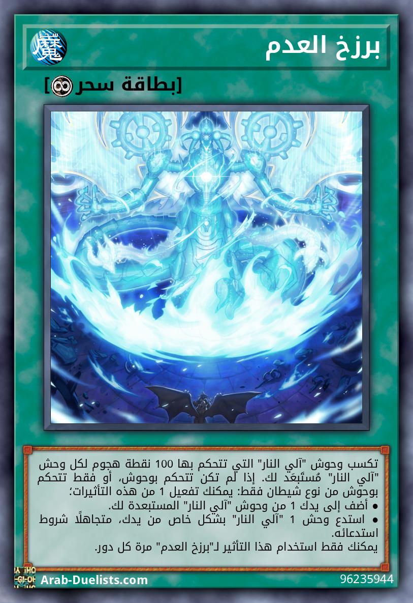 تكسب وحوش "آلي النار" التي تتحكم بها 100 نقطة هجوم لكل وحش "آلي النار" مُستَبعَد لك. إذا لم تكن تتحكم بوحوش، أو فقط تتحكم بوحوش من نوع شيطان فقط: يمكنك تفعيل 1 من هذه التأثيرات؛ ● أضف إلى يدك 1 من وحوش "آلي النار" المستبعدة لك. ● استدع وحش 1 "آلي النار" بشكل خاص من يدك، متجاهلًا شروط استدعائه. يمكنك فقط استخدام هذا التأثير لـ"برزخ العدم" مرة كل دور.