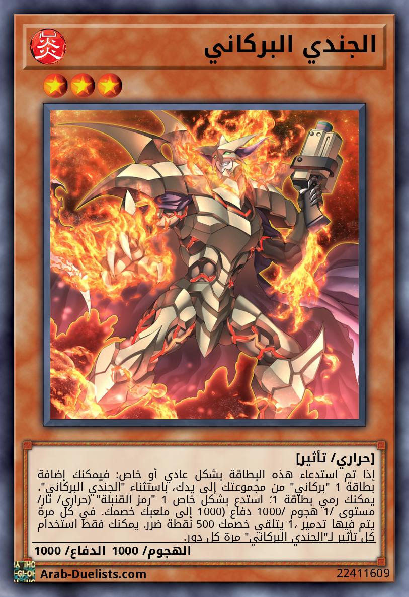 إذا تم استدعاء هذه البطاقة بشكل عادي أو خاص: فيمكنك إضافة بطاقة 1 "بركاني" من مجموعتك إلى يدك، باستثناء "الجندي البركاني". يمكنك رمي بطاقة 1؛ استدع بشكل خاص 1 "رمز القنبلة" (حراري/ نار/ مستوى 1/ هجوم 1000/ دفاع 1000) إلى ملعبك خصمك. في كل مرة يتم فيها تدمير 1، يتلقي خصمك 500 نقطة ضرر. يمكنك فقط استخدام كل تأثير لـ"الجندي البركاني" مرة كل دور.