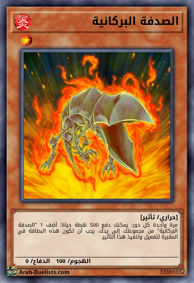 فعل 1 من هذه التأثيرات (ولكن يمكنك فقط استخدام كل تأثير لـ"الانبعاث البركاني" مرة كل دور)؛ ● خذ وحش "بركاني" 1 من مجموعتك، وأضفه إلى يدك أو استدعه بشكل خاص، متجاهلاً شروط استدعائه، ولكن أعده إلى اليد خلال مرحلة النهاية. ● استهدف وحش حراري 1 في الملعب؛ ألحق ضررًا بخصمك مساويًا لهجومه لأصلي، أو إذا استهدفت وحشًا تتحكم به، فسيتم تقليل الضرر إلى النصف.