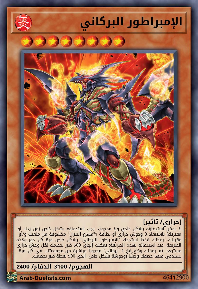 لا يمكن استدعاؤه بشكل عادي ولا محجوب. يجب استدعاؤه بشكل خاص (من يدك أو مقبرتك) باستبعاد 3 وحوش حراري أو بطاقة 1"مسرع النيران" مكشوفة من ملعبك و/أو مقبرتك. يمكنك فقط استدعاء "الإمبراطور البركاني" بشكل خاص مرة كل دور بهذه الطريقة. عند استدعائه بهذه الطريقة: يمكنك إلحاق 500 ضرر بخصمك لكل وحش حراري مستبعد، ثم يمكنك وضع فخ 1 "بركاني" محجوباً مباشرة من مجموعتك. في كل مرة يستدعي فيها خصمك وحشًا (وحوشًا) بشكل خاص، ألحق 500 نقطة ضرر بخصمك.