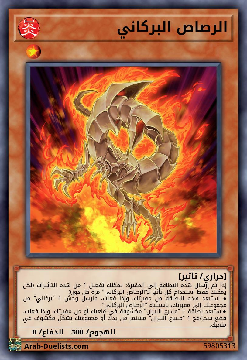 إذا تم إرسال هذه البطاقة إلى المقبرة: يمكنك تفعيل 1 من هذه التأثيرات (لكن يمكنك فقط استخدام كل تأثير لـ"الرصاص البركاني" مرة كل دور)؛ ● استبعد هذه البطاقة من مقبرتك، وإذا فعلت، فأرسل وحش 1 "بركاني" من مجموعتك إلى مقبرتك، باستثناء "الرصاص البركاني". ●استبعد بطاقة 1 "مسرع النيران" مكشوفة في ملعبك أو من مقبرتك، وإذا فعلت، فضع سحر/فخ 1 "مسرع النيران" مستمر من يدك أو مجموعتك بشكل مكشوف في ملعبك.