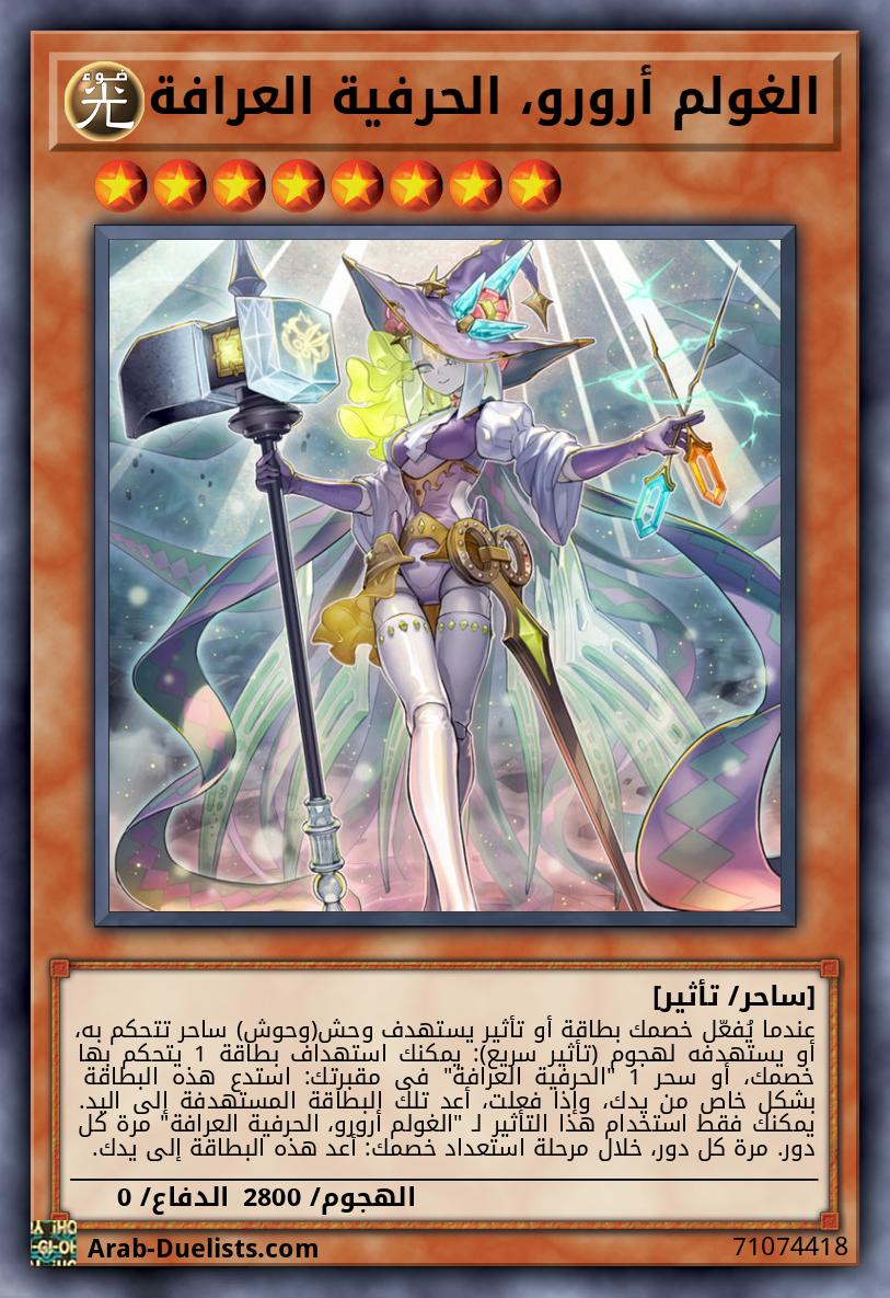 عندما يُفعّل خصمك بطاقة أو تأثير يستهدف وحش(وحوش) ساحر تتحكم به، أو يستهدفه لهجوم (تأثير سريع): يمكنك استهداف بطاقة 1 يتحكم بها خصمك، أو سحر 1 "الحرفية العرافة" فى مقبرتك: استدع هذه البطاقة بشكل خاص من يدك، وإذا فعلت، أعد تلك البطاقة المستهدفة إلى اليد. يمكنك فقط استخدام هذا التأثير لـ "الغولم أرورو، الحرفية العرافة" مرة كل دور. مرة كل دور، خلال مرحلة استعداد خصمك: أعد هذه البطاقة إلى يدك.