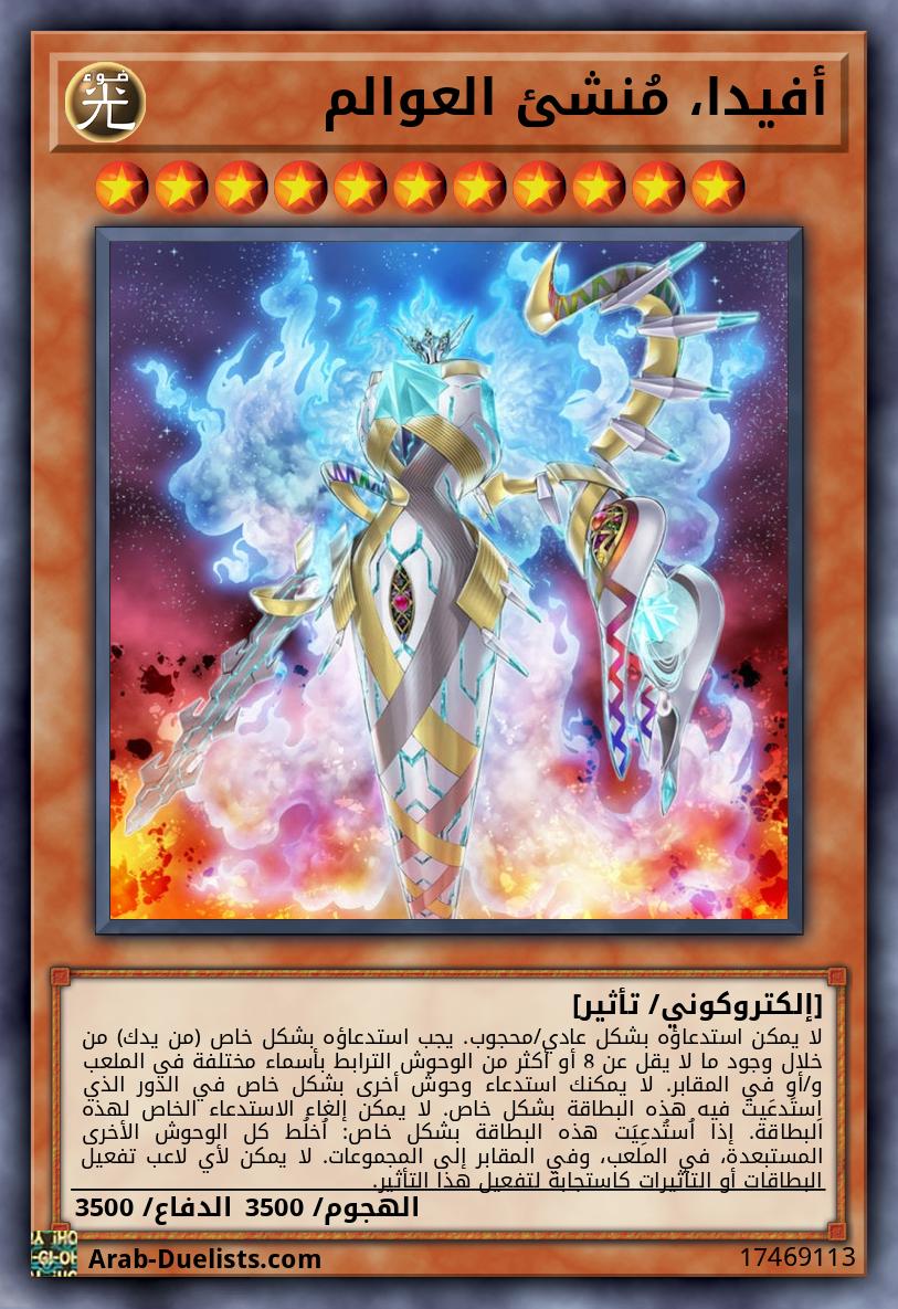 يمكنك فقط التحكم بـ 1 "إرث العالم". في كل مرة يرسل فيها وحش(وحوش) من المستوى 5 أو أعلى من الملعب إلى المقبرة، ضع عداداً 1 على هذه البطاقة لكل بطاقة مُرسلَة (كحد أقصى 7). يمكنك إرسال هذه البطاقة مع 7 عدادات إلى المقبرة؛ استدعِ وحش ترابط 1 إلكتروكوني بشكل خاص من مجموعتك الإضافية.