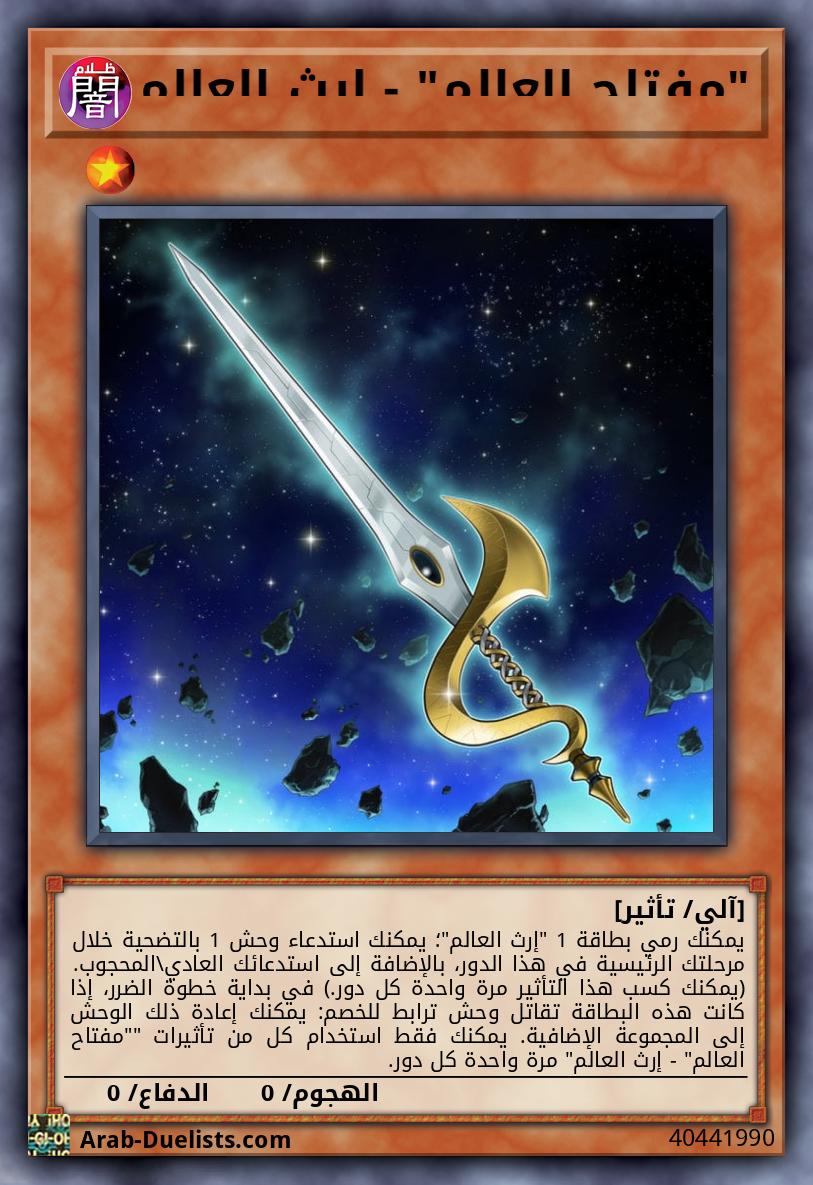 يمكنك رمي بطاقة 1 "إرث العالم"؛ يمكنك استدعاء وحش 1 بالتضحية خلال مرحلتك الرئيسية في هذا الدور، بالإضافة إلى استدعائك العادي\المحجوب. (يمكنك كسب هذا التأثير مرة واحدة كل دور.) في بداية خطوة الضرر، إذا كانت هذه البطاقة تقاتل وحش ترابط للخصم: يمكنك إعادة ذلك الوحش إلى المجموعة الإضافية. يمكنك فقط استخدام كل من تأثيرات ""مفتاح العالم" - إرث العالم" مرة واحدة كل دور.