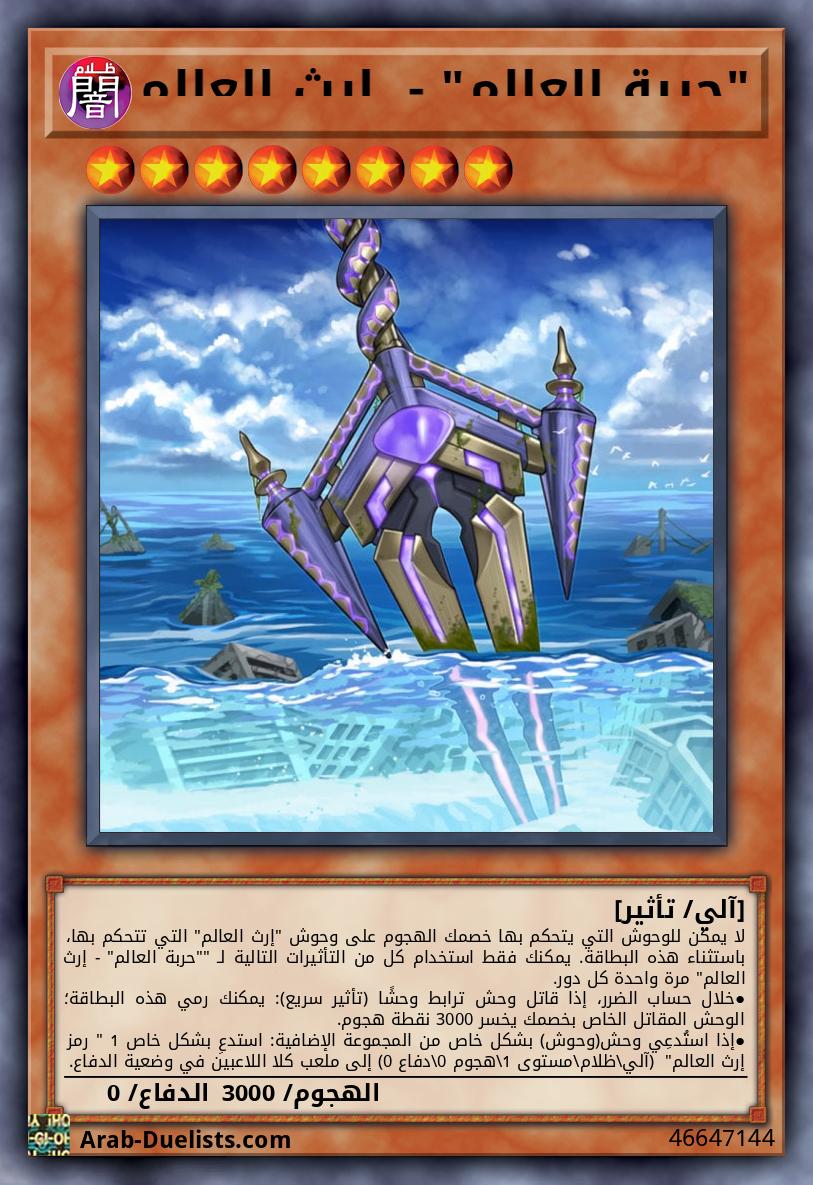 لا يمكن للوحوش التي يتحكم بها خصمك الهجوم على وحوش "إرث العالم" التي تتحكم بها، باستثناء هذه البطاقة. يمكنك فقط استخدام كل من التأثيرات التالية لـ ""حربة العالم" - إرث العالم" مرة واحدة كل دور. ●خلال حساب الضرر، إذا قاتل وحش ترابط وحشًا (تأثير سريع): يمكنك رمي هذه البطاقة؛ الوحش المقاتل الخاص بخصمك يخسر 3000 نقطة هجوم. ●إذا استُدعِي وحش(وحوش) بشكل خاص من المجموعة الإضافية: استدعِ بشكل خاص 1 " رمز إرث العالم" (آلي\ظلام\مستوى 1\هجوم 0\دفاع 0) إلى ملعب كلا اللاعبين في وضعية الدفاع.