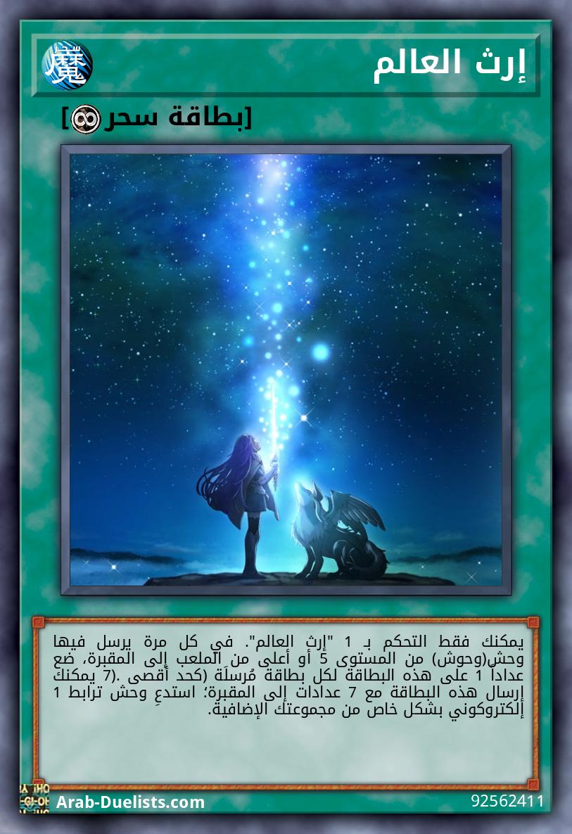 يمكن معاملة هذه البطاقة كتضحيتين 2 لاستدعاء وحش بالتضحية. يمكنك فقط استخدام كل من التأثيرات التالية لـ ""سفينة العالم" - إرث العالم" مرة واحدة كل دور. ● إذا دُمر وحش(وحوش) ترابط تتحكم به بتأثير بطاقات الخصم وأُرسِل إلى المقبرة (باستثناء خلال خطوة الضرر): يمكنك إرسال هذه البطاقة من يدك إلى المقبرة، ثم استهدف 1 من وحوش الترابط تلك؛ استدعه بشكل خاص. ● إذا اِستَدعَى خصمك وحشا(وحوشا) بشكل خاص من المجموعة الإضافية، بينما هذه البطاقة المستدعاة بشكل عادي\محجوب على الملعب (باستثناء خلال خطوة الضرر): يمكنك إرسال وحش 1 من مجموعتك إلى المقبرة.