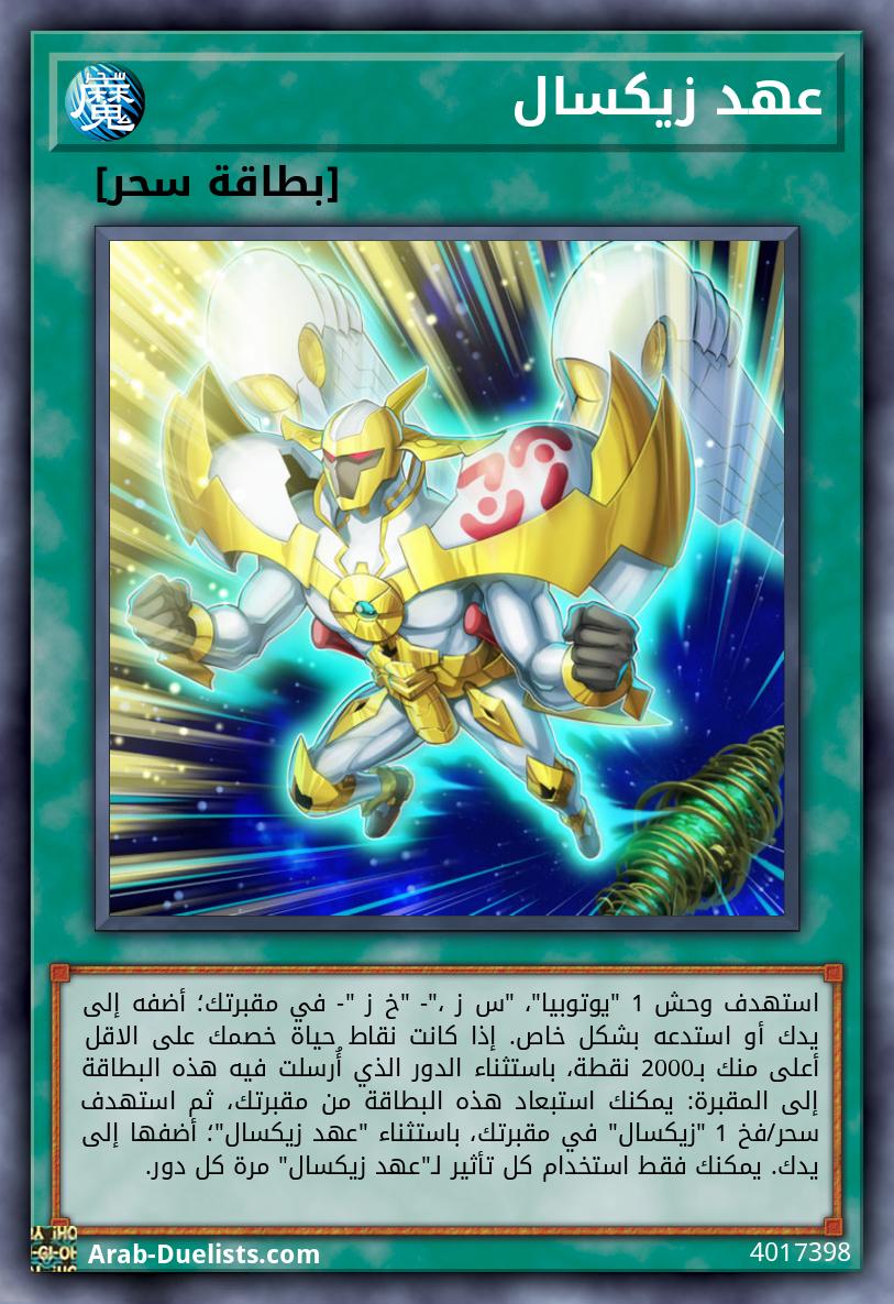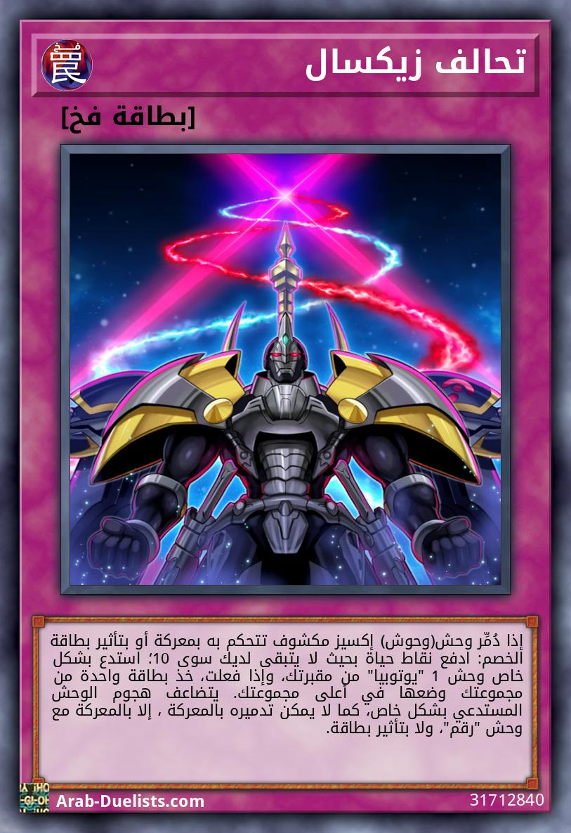 وحشان 2 مستوى 5 لا يمكنه الهجوم مباشرة. مرة كل دور: يمكنك فصل مادة إكسيز 1 من هذه البطاقة؛ أضف سحر/فخ 1 "زيكسال" من مجموعتك إلى يدك. يمكنك استهداف وحش 1 "يوتوبيا" تتحكم به؛ جَهِّزه بهذه البطاقة التي تتحكم بها كبطاقة سحر تجهير تُكسِبُه 3000 نقطة هجوم. عندما يدمر الوحش المجهز بهذه البطاقة وحشًا بالمعركة: يمكنك استدعاء أي عدد من بطاقات وحوش "ﺱﺯ" المُجهزة له.