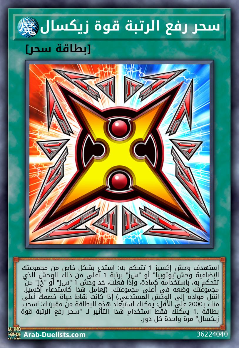 استهدف وحش إكسيز 1 تتحكم به؛ استدع بشكل خاص من مجموعتك الإضافية وحش"يوتوبيا" أو "ﺱﺯ" برتبة 1 أعلى من ذلك الوحش الذي تتحكم به، باستخدامه كمادة، وإذا فعلت، خذ وحش 1 "ﺱﺯ" أو "خﺯ" من مجموعتك وضعه في أعلى مجموعتك. (يُعامل هذا كاستدعاء إكسيز. انقل مواده إلى الوحش المستدعي.) إذا كانت نقاط حياة خصمك أعلى منك بـ2000 على الأقل: يمكنك استبعاد هذه البطاقة من مقبرتك؛ اسحب بطاقة 1. يمكنك فقط استخدام هذا التأثير لـ "سحر رفع الرتبة قوة زيكسال" مرة واحدة كل دور.