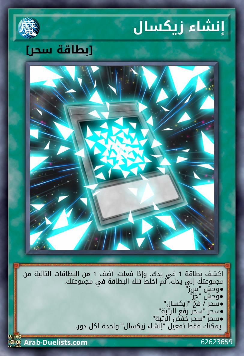 اكشف بطاقة 1 في يدك، وإذا فعلت، أضف 1 من البطاقات التالية من مجموعتك إلى يدك، ثم اخلط تلك البطاقة في مجموعتك. ●وحش "ﺱﺯ" ●وحش "خﺯ" ●سحر / فخ "زيكسال" ●سحر "سحر رفع الرتبة" ●سحر "سحر خفض الرتبة" يمكنك فقط تفعيل "إنشاء زيكسال" واحدة لكل دور.