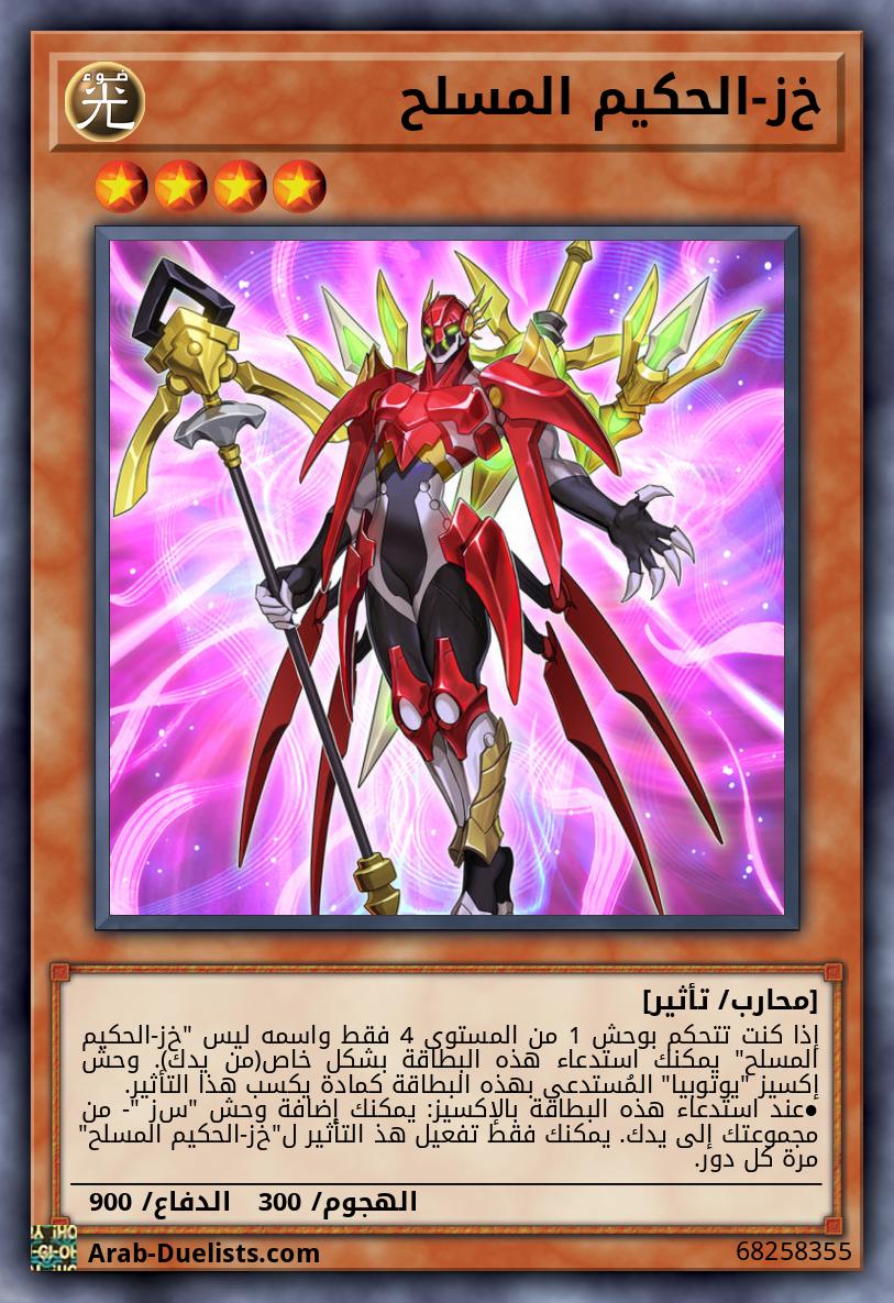 إذا كنت تتحكم بوحش 1 من المستوى 4 فقط واسمه ليس "خز-الحكيم المسلح" يمكنك استدعاء هذه البطاقة بشكل خاص(من يدك). وحش إكسيز "يوتوبيا" المُستدعى بهذه البطاقة كمادة يكسب هذا التأثير. ●عند استدعاء هذه البطاقة بالإكسيز: يمكنك إضافة وحش "ﺱﺯ -" من مجموعتك إلى يدك. يمكنك فقط تفعيل هذ التأثير ل"خز-الحكيم المسلح" مرة كل دور.
