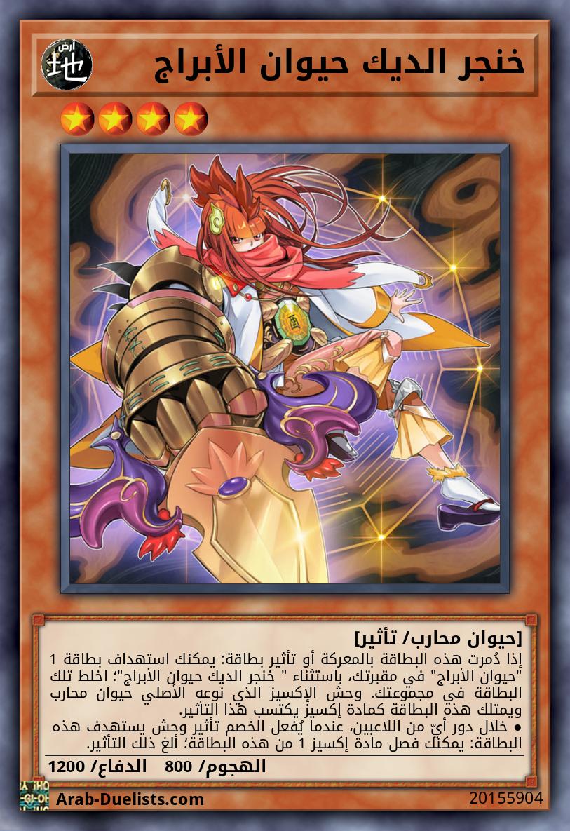 4 وحوش من المستوى 4 مرة واحدة كل دور، يمكنك أيضا استدعاء "رمح التنين حيوان الأبراج" بالإكسيز باستخدام وحش 1 "حيوان الأبراج" باسم مختلف كمادة إكسيز. (انقل مواده لهذه البطاقة.) تكسب هذه البطاقة نقاط هجوم ودفاع مساوية لمجموع نقاط الهجوم والدفاع لوحوش "حيوان الأبراج" المرفقة لهذه البطاقة. مرة واحدة كل دور (تأثير سريع): يمكنك فصل مادة إكسيز 1 من هذه البطاقة، ثم استهدف بطاقة 1 مكشوفة في الملعب؛ دمر ذلك الهدف.