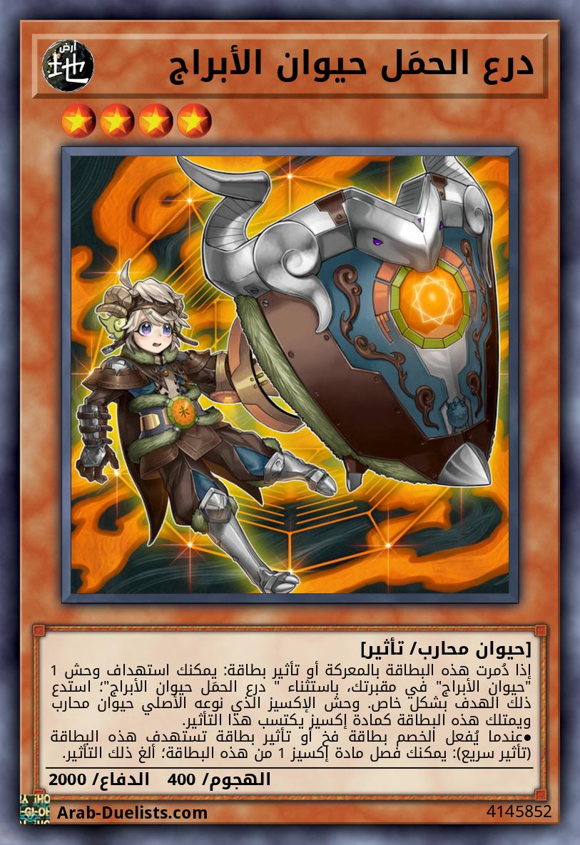 إذا دُمرت هذه البطاقة بالمعركة أو تأثير بطاقة: يمكنك استهداف وحش 1 "حيوان الأبراج" في مقبرتك، باستثناء " درع الحمَل حيوان الأبراج"؛ استدع ذلك الهدف بشكل خاص. وحش الإكسيز الذي نوعه الأصلي حيوان محارب ويمتلك هذه البطاقة كمادة إكسيز يكتسب هذا التأثير. ●عندما يُفعل الخصم بطاقة فخ أو تأثير بطاقة تستهدف هذه البطاقة (تأثير سريع): يمكنك فصل مادة إكسيز 1 من هذه البطاقة؛ ألغ ذلك التأثير.