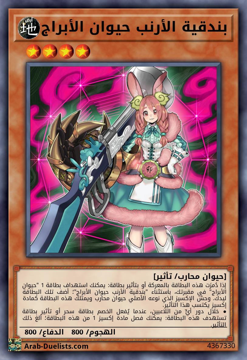 إذا دُمرَت هذه البطاقة بالمعركة أو بتأثير بطاقة: يمكنك استهداف بطاقة 1 "حيوان الأبراج" في مقبرتك، باستثناء "بندقية الأرنب حيوان الأبراج"؛ أضف تلك البطاقة ليدك. وحش الإكسيز الذي نوعه الأصلي حيوان محارب ويمتلك هذه البطاقة كمادة إكسيز يكتسب هذا التأثير. ● خلال دور أيٍّ من اللاعبين، عندما يُفعل الخصم بطاقة سحر أو تأثير بطاقة تستهدف هذه البطاقة: يمكنك فصل مادة إكسيز 1 من هذه البطاقة؛ ألغ ذلك التأثير.