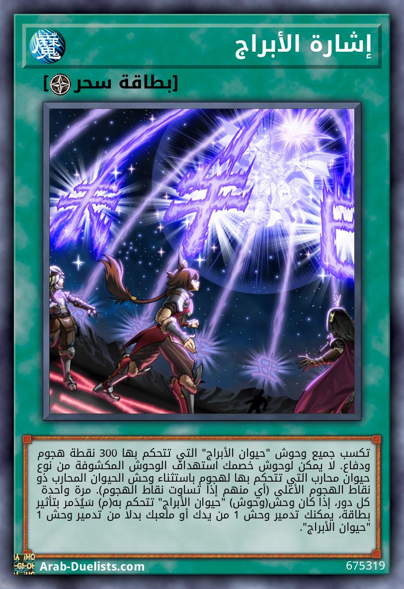 تكسب جميع وحوش "حيوان الأبراج" التي تتحكم بها 300 نقطة هجوم ودفاع. لا يمكن لوحوش خصمك استهداف الوحوش المكشوفة من نوع حيوان محارب التي تتحكم بها لهجوم باستثناء وحش الحيوان المحارب ذو نقاط الهجوم الأعلى (أي منهم إذا تساوت نقاط الهجوم). مرة واحدة كل دور، إذا كان وحش(وحوش) "حيوان الأبراج" تتحكم به(م) سَيُدَمر بتأثير بطاقة، يمكنك تدمير وحش 1 من يدك أو ملعبك بدلا من تدمير وحش 1 "حيوان الأبراج".