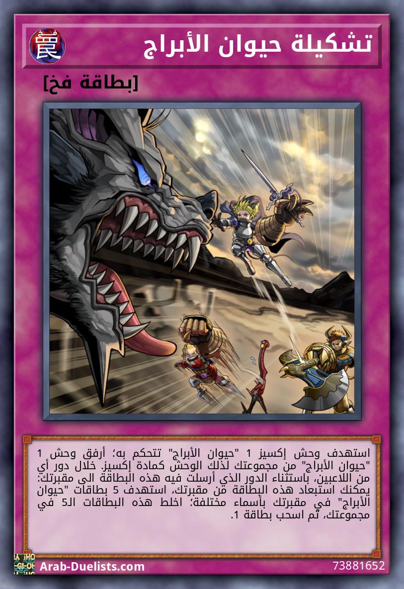 استهدف وحش إكسيز 1 "حيوان الأبراج" تتحكم به؛ أرفق وحش 1 "حيوان الأبراج" من مجموعتك لذلك الوحش كمادة إكسيز. خلال دور أي من اللاعبين، باستثناء الدور الذي أرسلت فيه هذه البطاقة الى مقبرتك: يمكنك استبعاد هذه البطاقة من مقبرتك، استهدف 5 بطاقات "حيوان الأبراج" في مقبرتك بأسماء مختلفة؛ اخلط هذه البطاقات الـ5 في مجموعتك، ثم اسحب بطاقة 1.