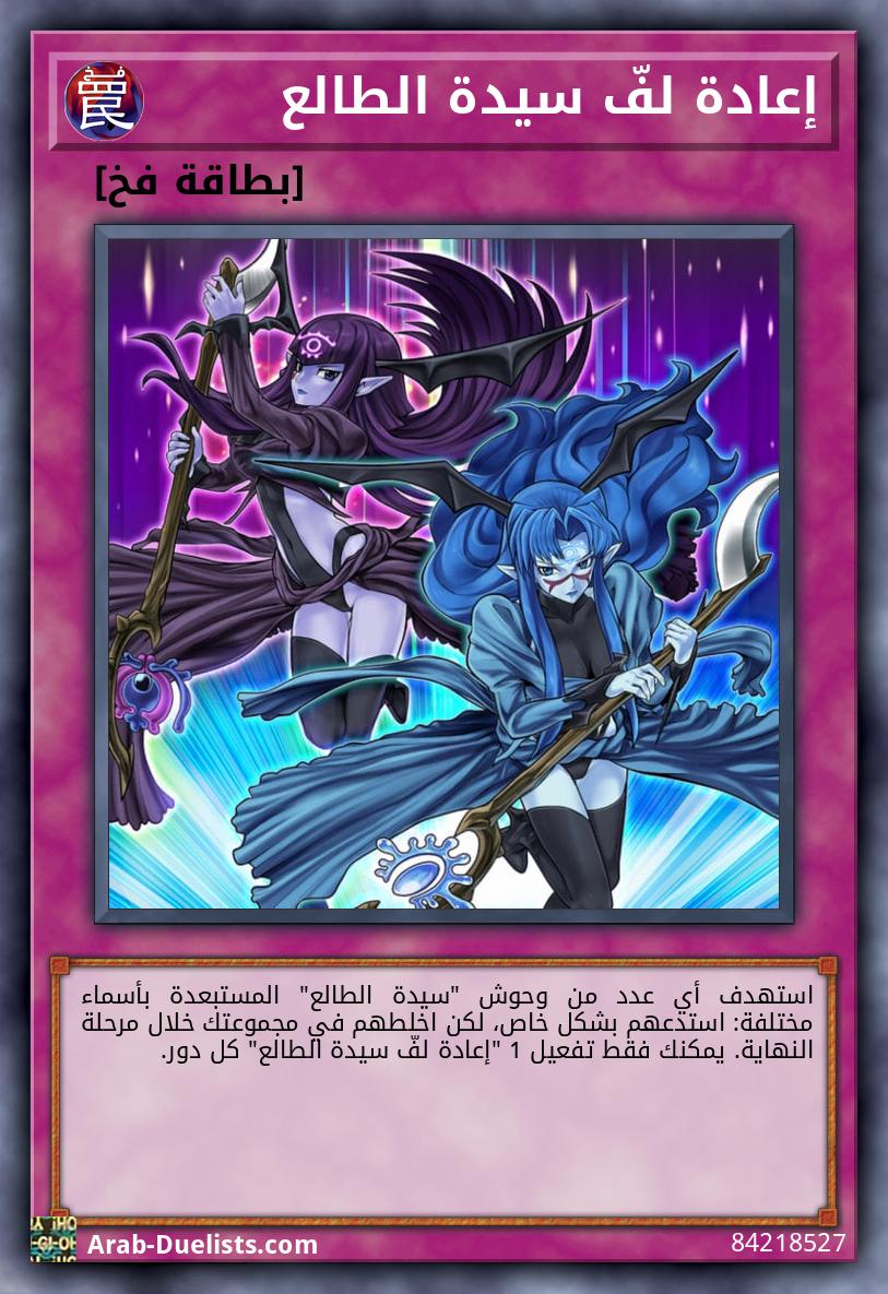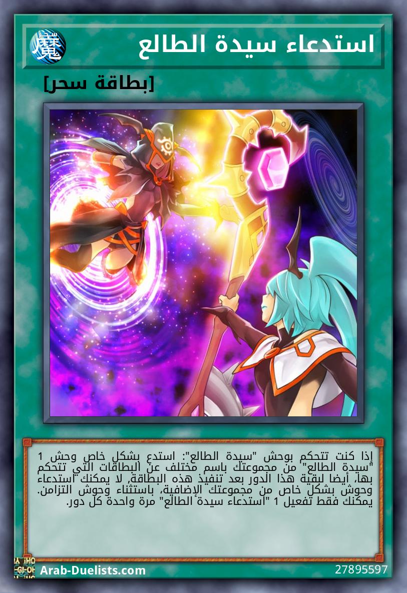 إذا كنت تتحكم بوحش "سيدة الطالع": استدع بشكل خاص وحش 1 "سيدة الطالع" من مجموعتك باسم مختلف عن البطاقات التي تتحكم بها، أيضا لبقية هذا الدور بعد تنفيذ هذه البطاقة, لا يمكنك استدعاء وحوش بشكل خاص من مجموعتك الإضافية، باستثناء وحوش التزامن. يمكنك فقط تفعيل 1 "استدعاء سيدة الطالع" مرة واحدة كل دور.