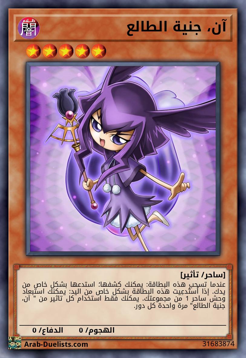 عندما تسحب هذه البطاقة: يمكنك كشفها؛ استدعها بشكل خاص من يدك. إذا اُستُدعِيت هذه البطاقة بشكل خاص من اليد: يمكنك استبعاد وحش ساحر 1 من مجموعتك. يمكنك فقط استخدام كل تاثير من " آن، جنية الطالع" مرة واحدة كل دور.