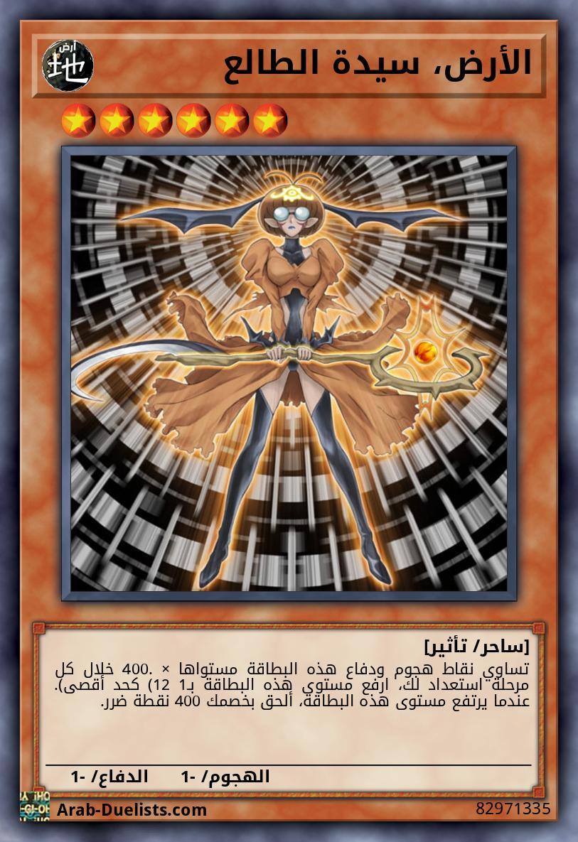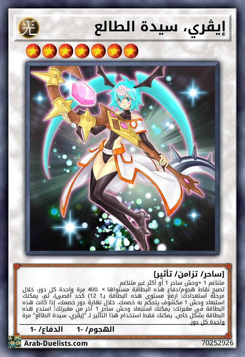 متناغم 1 +وحش ساحر 1 أو أكثر غير متناغم تصبح نقاط هجوم/دفاع هذه البطاقة مستواها × 400. مرة واحدة كل دور، خلال مرحلة استعدادك: ارفع مستوى هذه البطاقة بـ1 (12 كحد أقصى)، ثم، يمكنك استبعاد وحش 1 مكشوف يتحكم به خصمك. خلال نهاية دور خصمك، إذا كانت هذه البطاقة في مقبرتك: يمكنك استبعاد وحش ساحر 1 آخر من مقبرتك؛ استدع هذه البطاقة بشكل خاص. يمكنك فقط استخدام هذا التأثير لـ "إيڤري، سيدة الطالع" مرة واحدة كل دور.