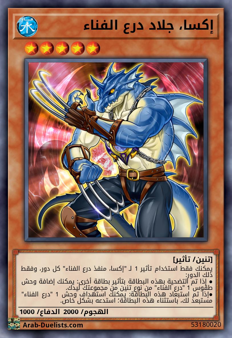 يمكنك فقط استخدام تأثير 1 لـ "إكسا، منفذ درع الفناء" كل دور، وفقط ذلك الدور: ● إذا تم التضحية بهذه البطاقة بتأثير بطاقة أخرى: يمكنك إضافة وحش طقوس 1 "درع الفناء" من نوع تنين من مجموعتك ليدك. ●إذا تم استبعاد هذه البطاقة: يمكنك استهداف وحش 1 "درع الفناء" مستبعد لك، باستثناء هذه البطاقة؛ استدعه بشكل خاص.