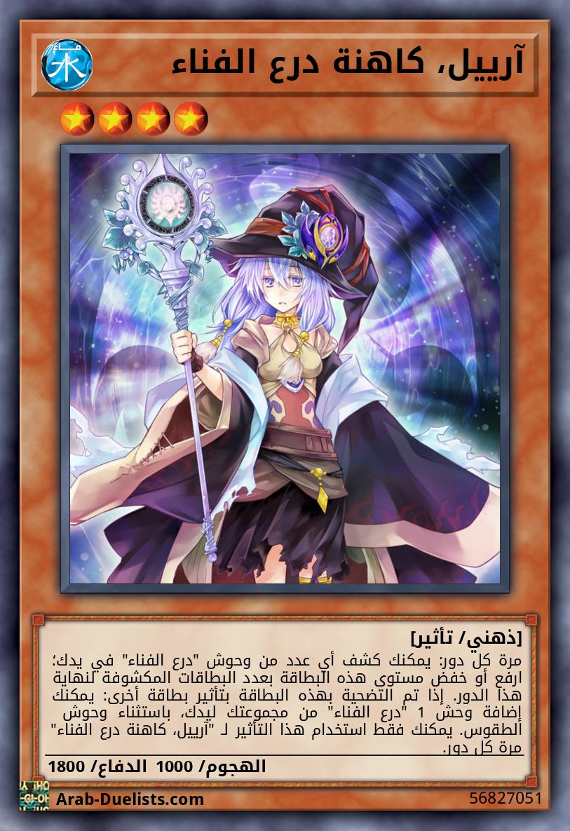 مرة كل دور: يمكنك كشف أي عدد من وحوش "درع الفناء" في يدك؛ ارفع أو خفض مستوى هذه البطاقة بعدد البطاقات المكشوفة لنهاية هذا الدور. إذا تم التضحية بهذه البطاقة بتأثير بطاقة أخرى: يمكنك إضافة وحش 1 "درع الفناء" من مجموعتك ليدك، باستثناء وحوش الطقوس. يمكنك فقط استخدام هذا التأثير لـ "آرييل، كاهنة درع الفناء" مرة كل دور.