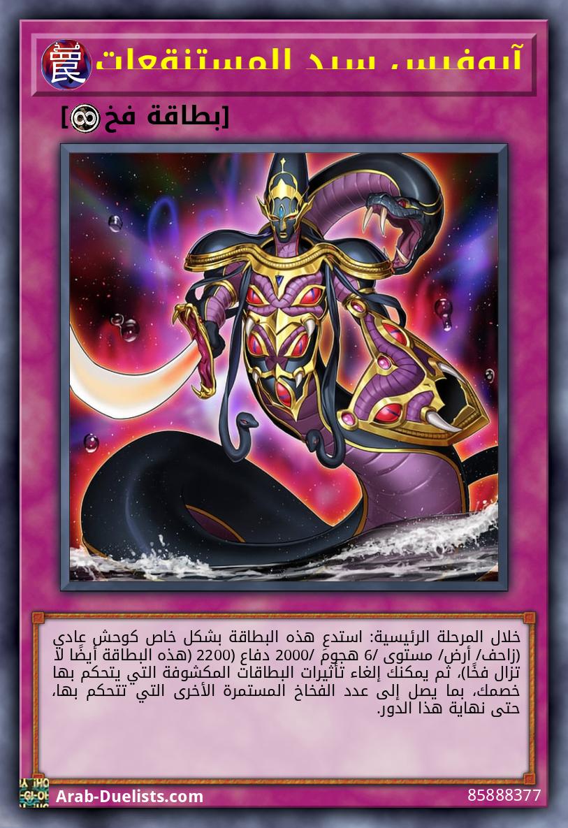(1) استدعِه بشكل خاص كوحش عادي (زاحف/ أرض/ مستوى 4/ هجوم 1600/ دفاع 1800) (لا تزال هذه البطاقة فخًا)، ثم يمكنك وضع فخ 1 "آبوفيس" محجوبًا من مجموعتك، باستثناء "آبوفيس الثعبان". ويمكن تفعيله هذا الدور. (2) إذا تم إرسال هذه البطاقة إلى المقبرة: فيمكنك إضافة 1 "تجسيد آبوفيس" من مجموعتك إلى يدك. يمكنك فقط استخدام كل تأثير لـ"آبوفيس الثعبان" مرة كل دور.