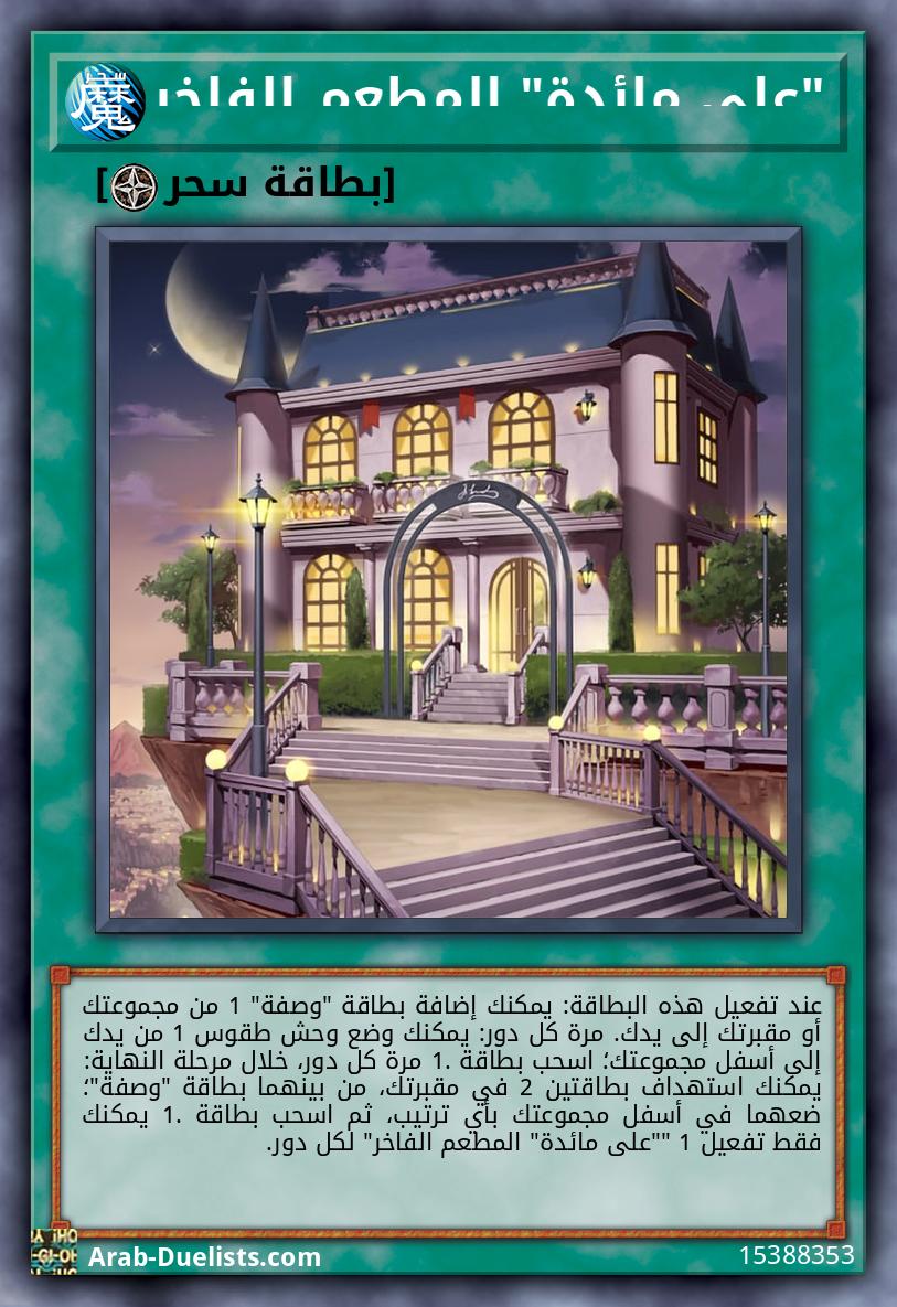 عند تفعيل هذه البطاقة: يمكنك إضافة بطاقة "وصفة" 1 من مجموعتك أو مقبرتك إلى يدك. مرة كل دور: يمكنك وضع وحش طقوس 1 من يدك إلى أسفل مجموعتك؛ اسحب بطاقة 1. مرة كل دور، خلال مرحلة النهاية: يمكنك استهداف بطاقتين 2 في مقبرتك، من بينهما بطاقة "وصفة"؛ ضعهما في أسفل مجموعتك بأي ترتيب، ثم اسحب بطاقة 1. يمكنك فقط تفعيل 1 ""على مائدة" المطعم الفاخر" لكل دور.