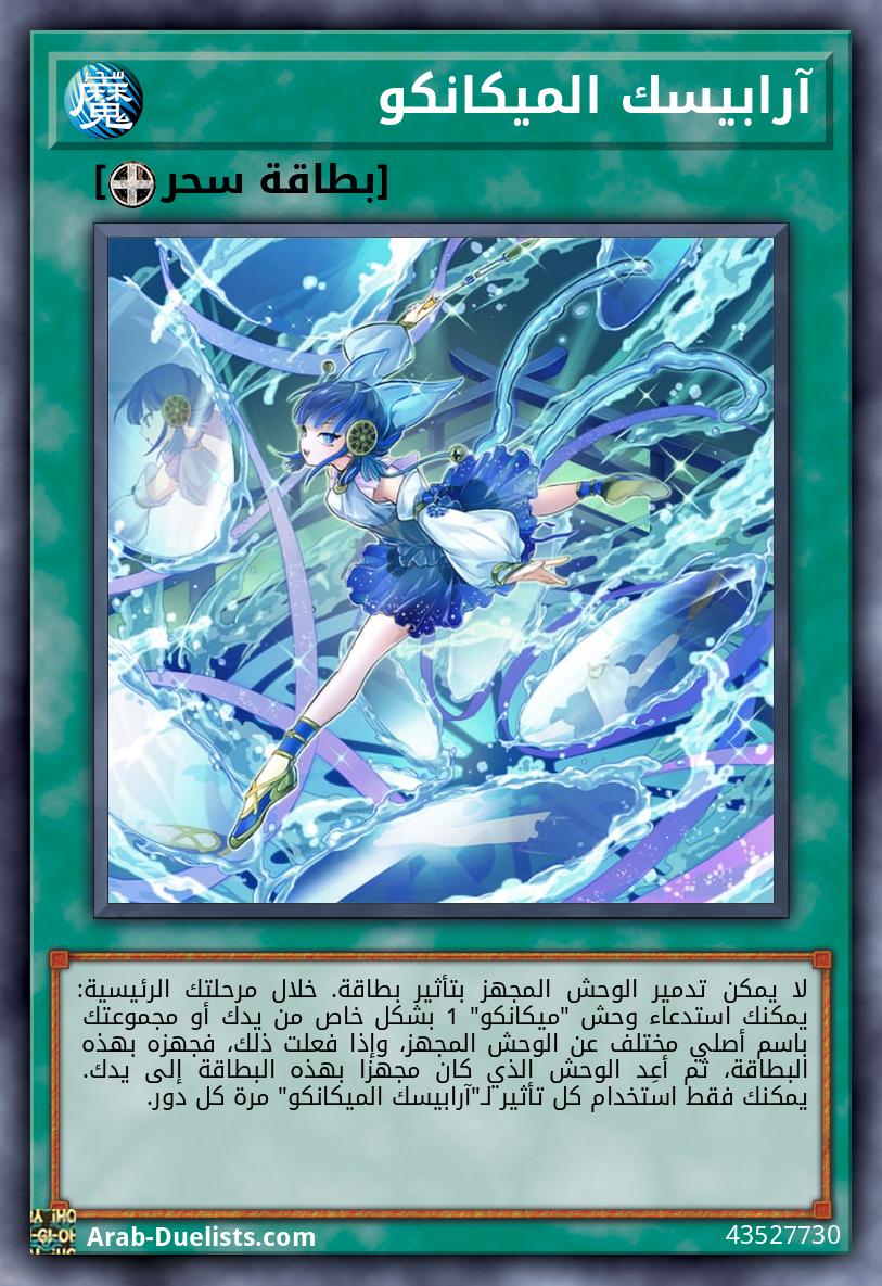 لا يمكن تدمير الوحش المجهز بتأثير بطاقة. خلال مرحلتك الرئيسية: يمكنك استدعاء وحش "ميكانكو" 1 بشكل خاص من يدك أو مجموعتك باسم أصلي مختلف عن الوحش المجهز، وإذا فعلت ذلك، فجهزه بهذه البطاقة، ثم أعِد الوحش الذي كان مجهزا بهذه البطاقة إلى يدك. يمكنك فقط استخدام كل تأثير لـ"آرابيسك الميكانكو" مرة كل دور.