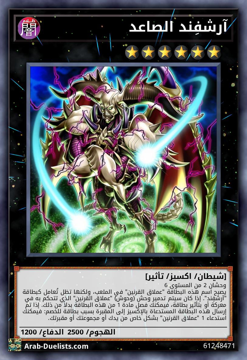 وحشان 2 من المستوى 6 يصبح اسم هذه البطاقة "عملاق القرنين" في الملعب، ولكنها تظل تُعامل كبطاقة "آرشفِند". إذا كان سيتم تدمير وحش (وحوش) "عملاق القرنين" الذي تتحكم به في معركة أو بتأثير بطاقة، فيمكنك فصل مادة 1 من هذه البطاقة بدلاً من ذلك. إذا تم إرسال هذه البطاقة المستدعاة بالإكسيز إلى المقبرة بسبب بطاقة للخصم: فيمكنك استدعاء 1 "عملاق القرنين" بشكل خاص من يدك أو مجموعتك أو مقبرتك.