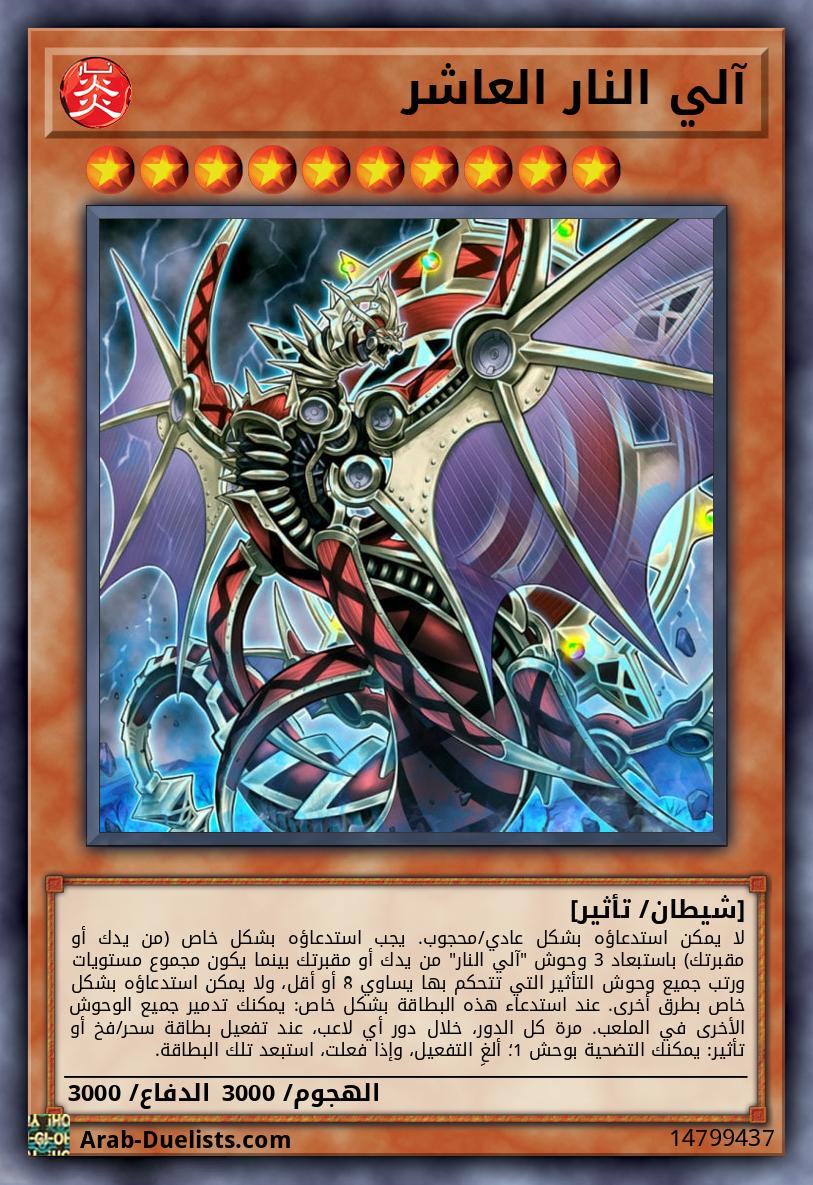 لا يمكن استدعاؤه بشكل عادي/محجوب. يجب استدعاؤه بشكل خاص (من يدك أو مقبرتك) باستبعاد 3 وحوش "آلي النار" من يدك أو مقبرتك بينما يكون مجموع مستويات ورتب جميع وحوش التأثير التي تتحكم بها يساوي 8 أو أقل، ولا يمكن استدعاؤه بشكل خاص بطرق أخرى. عند استدعاء هذه البطاقة بشكل خاص: يمكنك تدمير جميع الوحوش الأخرى في الملعب. مرة كل الدور، خلال دور أي لاعب، عند تفعيل بطاقة سحر/فخ أو تأثير: يمكنك التضحية بوحش 1؛ ألغِ التفعيل، وإذا فعلت، استبعد تلك البطاقة.
