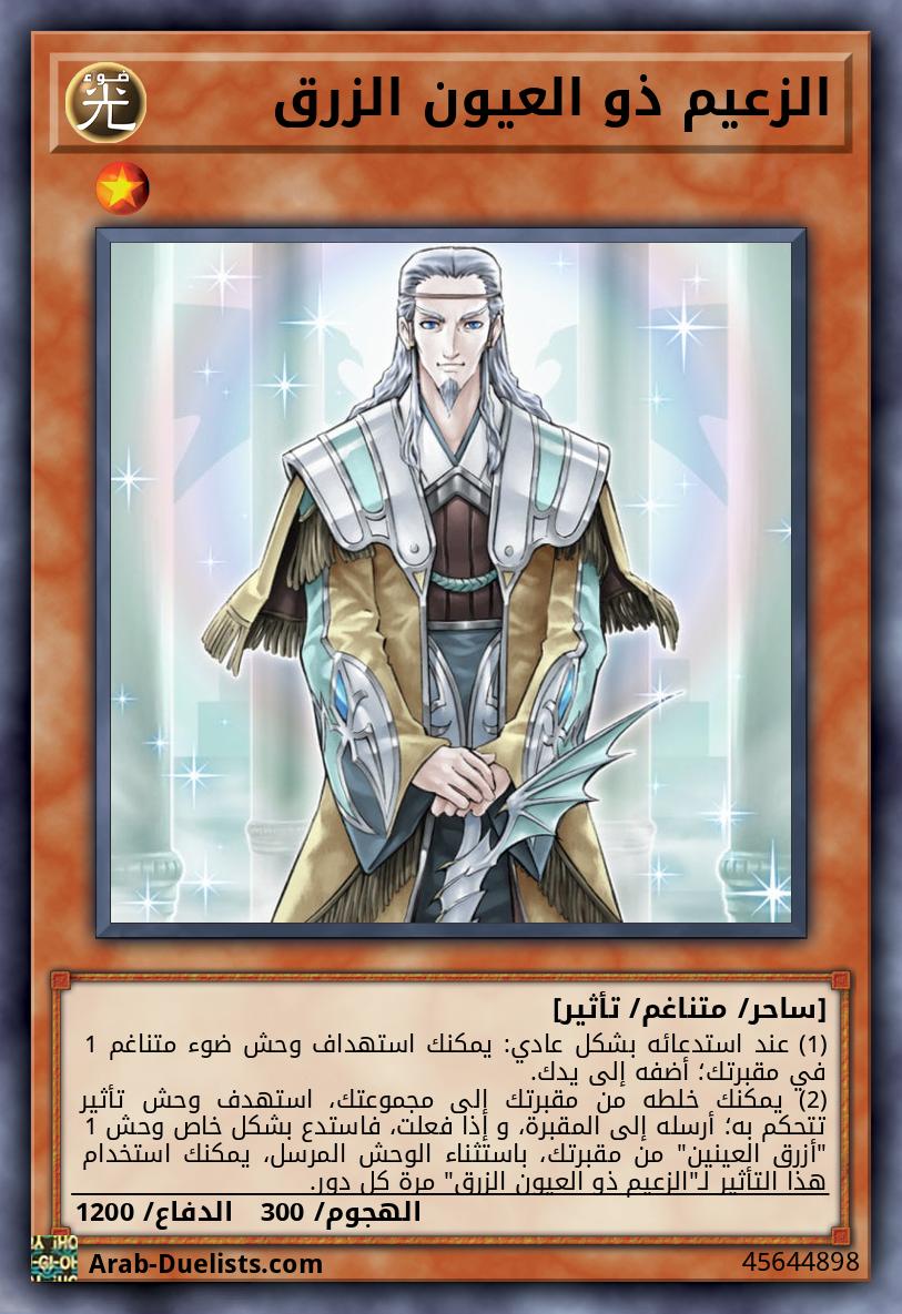 (1) عند استدعائه بشكل عادي: يمكنك استهداف وحش ضوء متناغم 1 في مقبرتك؛ أضفه إلى يدك. (2) يمكنك خلطه من مقبرتك إلى مجموعتك، استهدف وحش تأثير تتحكم به؛ أرسله إلى المقبرة، و إذا فعلت، فاستدع بشكل خاص وحش 1 "أزرق العينين" من مقبرتك، باستثناء الوحش المرسل، يمكنك استخدام هذا التأثير لـ"الزعيم ذو العيون الزرق" مرة كل دور.