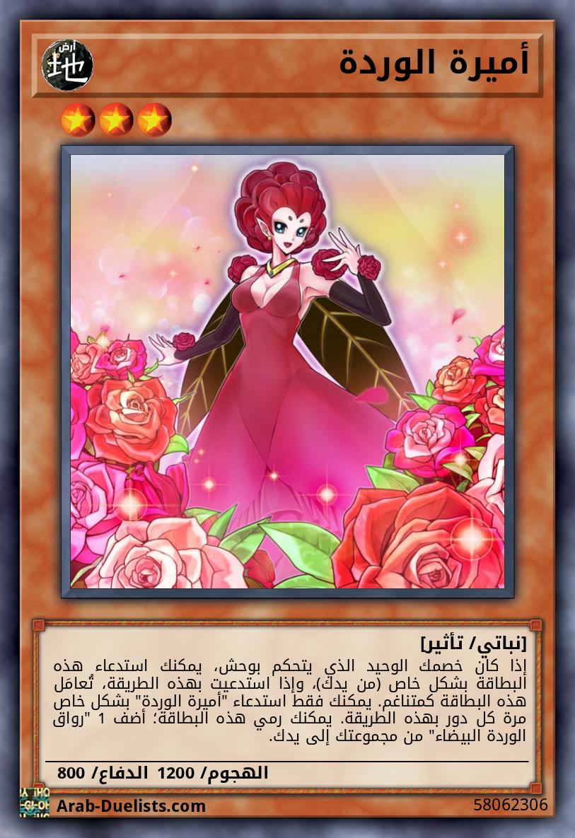 إذا كان خصمك الوحيد الذي يتحكم بوحش، يمكنك استدعاء هذه البطاقة بشكل خاص (من يدك)، وإذا استدعيت بهذه الطريقة، تُعامَل هذه البطاقة كمتناغم. يمكنك فقط استدعاء "أميرة الوردة" بشكل خاص مرة كل دور بهذه الطريقة. يمكنك رمي هذه البطاقة؛ أضف 1 "رواق الوردة البيضاء" من مجموعتك إلى يدك.