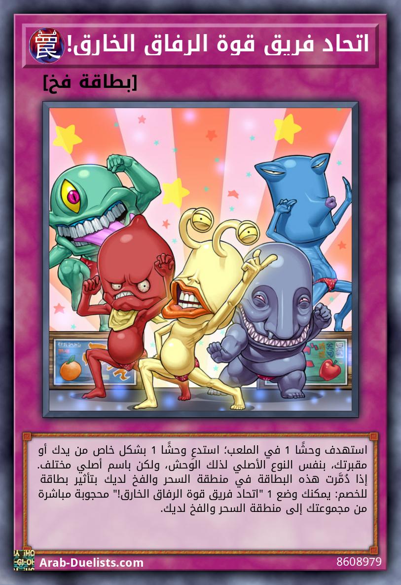 استهدف وحشًا 1 في الملعب؛ استدعِ وحشًا 1 بشكل خاص من يدك أو مقبرتك، بنفس النوع الأصلي لذلك الوحش، ولكن باسم أصلي مختلف. إذا دُمَّرت هذه البطاقة في منطقة السحر والفخ لديك بتأثير بطاقة للخصم: يمكنك وضع 1 "اتحاد فريق قوة الرفاق الخارق!" محجوبة مباشرة من مجموعتك إلى منطقة السحر والفخ لديك.