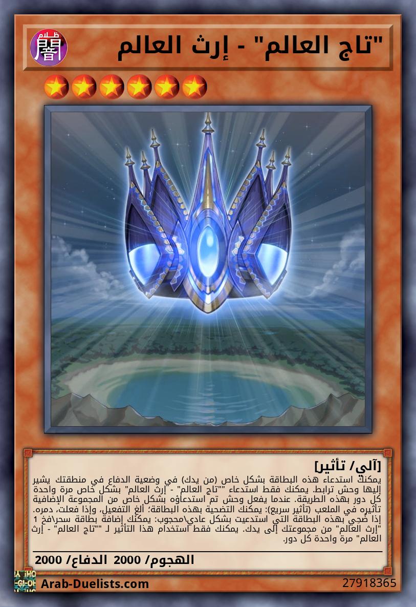 يمكنك استدعاء هذه البطاقة بشكل خاص (من يدك) في وضعية الدفاع في منطقتك يشير إليها وحش ترابط. يمكنك فقط استدعاء ""تاج العالم" - إرث العالم" بشكل خاص مرة واحدة كل دور بهذه الطريقة. عندما يفعل وحش تم استدعاؤه بشكل خاص من المجموعة الإضافية تأثيره في الملعب (تأثير سريع): يمكنك التضحية بهذه البطاقة؛ ألغِ التفعيل، وإذا فعلت، دمره. إذا ضُحِي بهذه البطاقة التي استدعيت بشكل عادي\محجوب: يمكنك إضافة بطاقة سحر\فخ 1 "إرث العالم" من مجموعتك إلى يدك. يمكنك فقط استخدام هذا التأثير لـ ""تاج العالم" - إرث العالم" مرة واحدة كل دور.