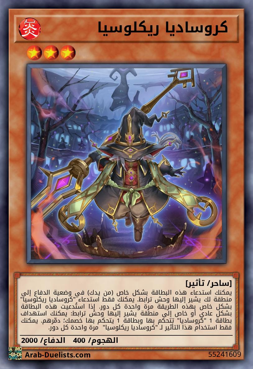 يمكنك استدعاء هذه البطاقة بشكل خاص (من يدك) في وضعية الدفاع إلى منطقة لك يشير إليها وحش ترابط. يمكنك فقط استدعاء "كروساديا ريكلوسيا" بشكل خاص بهذه الطريقة مرة واحدة كل دور. إذا استُدعيت هذه البطاقة بشكل عادي أو خاص إلى منطقة يشير إليها وحش ترابط: يمكنك استهداف بطاقة 1 "كروساديا" تتحكم بها وبطاقة 1 يتحكم بها خصمك؛ دمّرهم. يمكنك فقط استخدام هذا التأثير لـ "كروساديا ريكلوسيا" مرة واحدة كل دور.