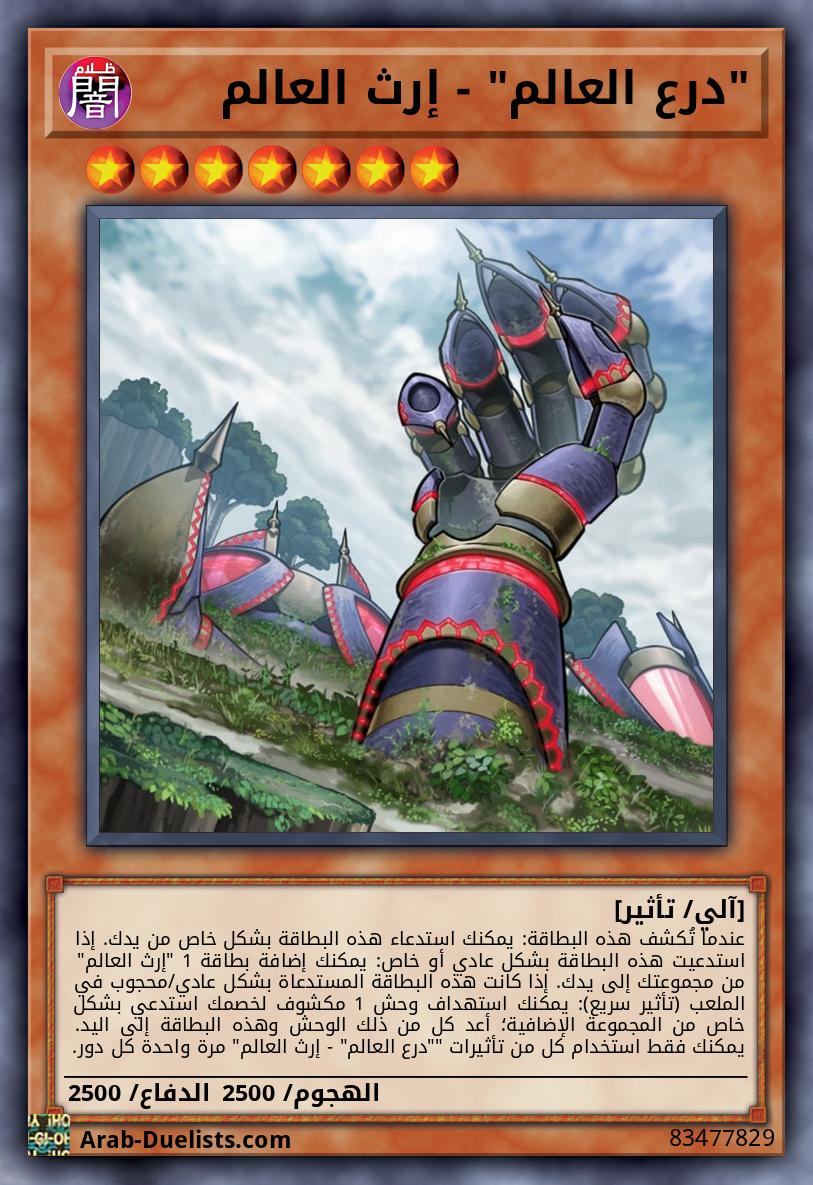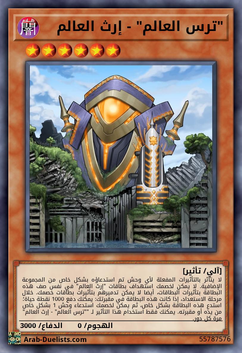 لا يتأثر بالتأثيرات المفعلة لأي وحش تم استدعاؤه بشكل خاص من المجموعة الإضافية. لا يمكن لخصمك استهداف بطاقات "إرث العالم" في نفس صف هذه البطاقة بتأثيرات البطاقات، أيضا لا يمكن تدميرهم بتأثيرات بطاقات خصمك. خلال مرحلة الاستعداد، إذا كانت هذه البطاقة في مقبرتك: يمكنك دفع 1000 نقطة حياة؛ استدعِ هذه البطاقة بشكل خاص، ثم يمكن لخصمك استدعاء وحش 1 بشكل خاص من يده أو مقبرته. يمكنك فقط استخدام هذا التأثير لـ ""ترس العالم" - إرث العالم" مرة كل دور.