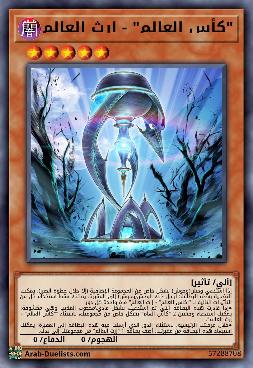 إذا استُدعي وحش(وحوش) بشكل خاص من المجموعة الإضافية (إلا خلال خطوة الضرر): يمكنك التضحية بهذه البطاقة؛ أرسل ذلك الوحش(وحوش) إلى المقبرة. يمكنك فقط استخدام كل من التأثيرات التالية لـ ""كأس العالم" - إرث العالم" مرة واحدة كل دور. ●إذا غادرت هذه البطاقة التي تم استُدعيت بشكل عادي\محجوب الملعب وهي مكشوفة: يمكنك استدعاء وحشين 2 "كأس العام" بشكل خاص من مجموعتك، باستثاء ""كأس العالم" - إرث العالم". ●خلال مرحلتك الرئيسية، باستثناء الدور الذي أرسلت فيه هذه البطاقة إلى المقبرة: يمكنك استبعاد هذه البطاقة من مقبرتك؛ أضف بطاقة 1 "إرث العالم" من مجموعتك إلى يدك.