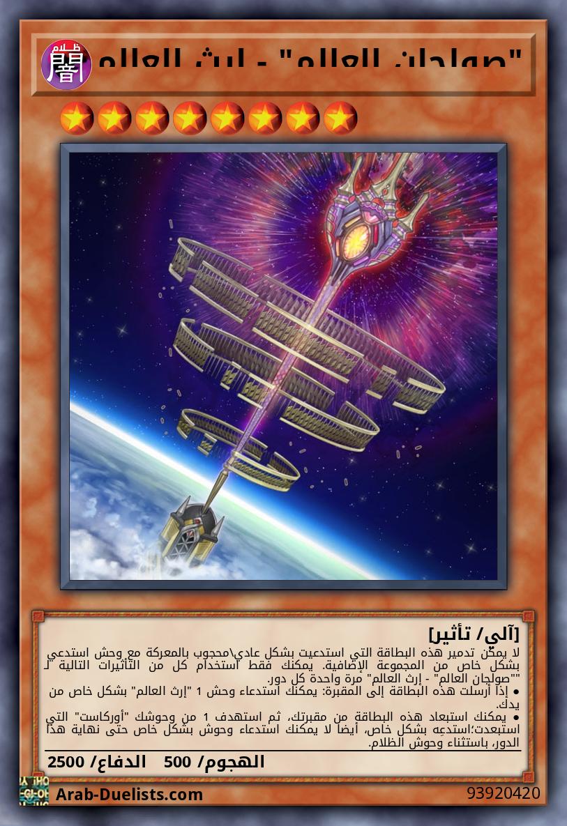 لا يمكن تدمير هذه البطاقة التي استدعيت بشكل عادي\محجوب بالمعركة مع وحش استدعي بشكل خاص من المجموعة الإضافية. يمكنك فقط استخدام كل من التأثيرات التالية لـ ""صولجان العالم" - إرث العالم" مرة واحدة كل دور. ● إذا أرسلت هذه البطاقة إلى المقبرة: يمكنك استدعاء وحش 1 "إرث العالم" بشكل خاص من يدك. ● يمكنك استبعاد هذه البطاقة من مقبرتك، ثم استهدف 1 من وحوشك "أوركاست" التي استبعدت؛استدعِه بشكل خاص، أيضا لا يمكنك استدعاء وحوش بشكل خاص حتى نهاية هذا الدور، باستثناء وحوش الظلام.
