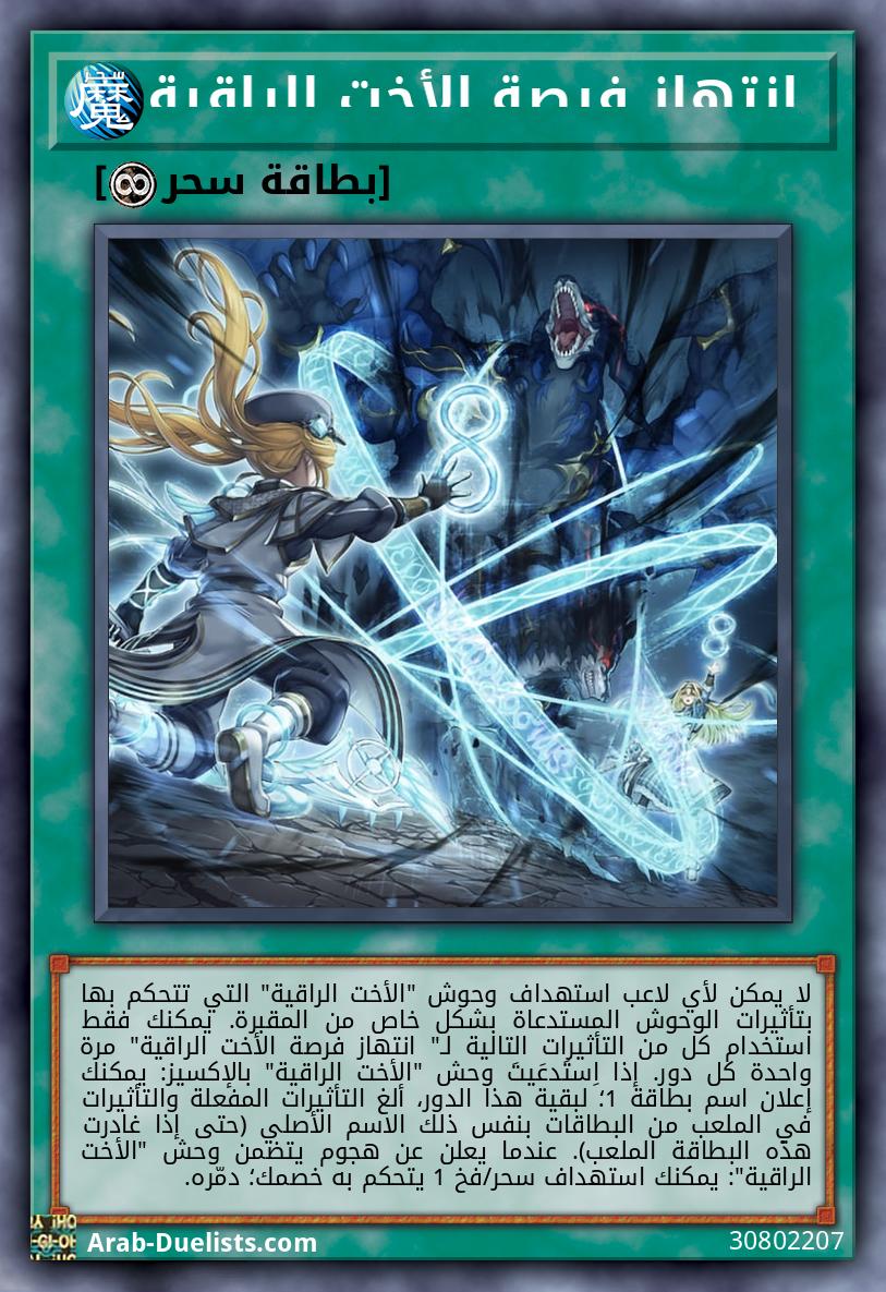لا يمكن لأي لاعب استهداف وحوش "الأخت الراقية" التي تتحكم بها بتأثيرات الوحوش المستدعاة بشكل خاص من المقبرة. يمكنك فقط استخدام كل من التأثيرات التالية لـ" انتهاز فرصة الأخت الراقية" مرة واحدة كل دور. إذا اِستَدعَيتَ وحش "الأخت الراقية" بالإكسيز: يمكنك إعلان اسم بطاقة 1؛ لبقية هذا الدور، ألغ التأثيرات المفعلة والتأثيرات في الملعب من البطاقات بنفس ذلك الاسم الأصلي (حتى إذا غادرت هذه البطاقة الملعب). عندما يعلن عن هجوم يتضمن وحش "الأخت الراقية": يمكنك استهداف سحر/فخ 1 يتحكم به خصمك؛ دمّره.