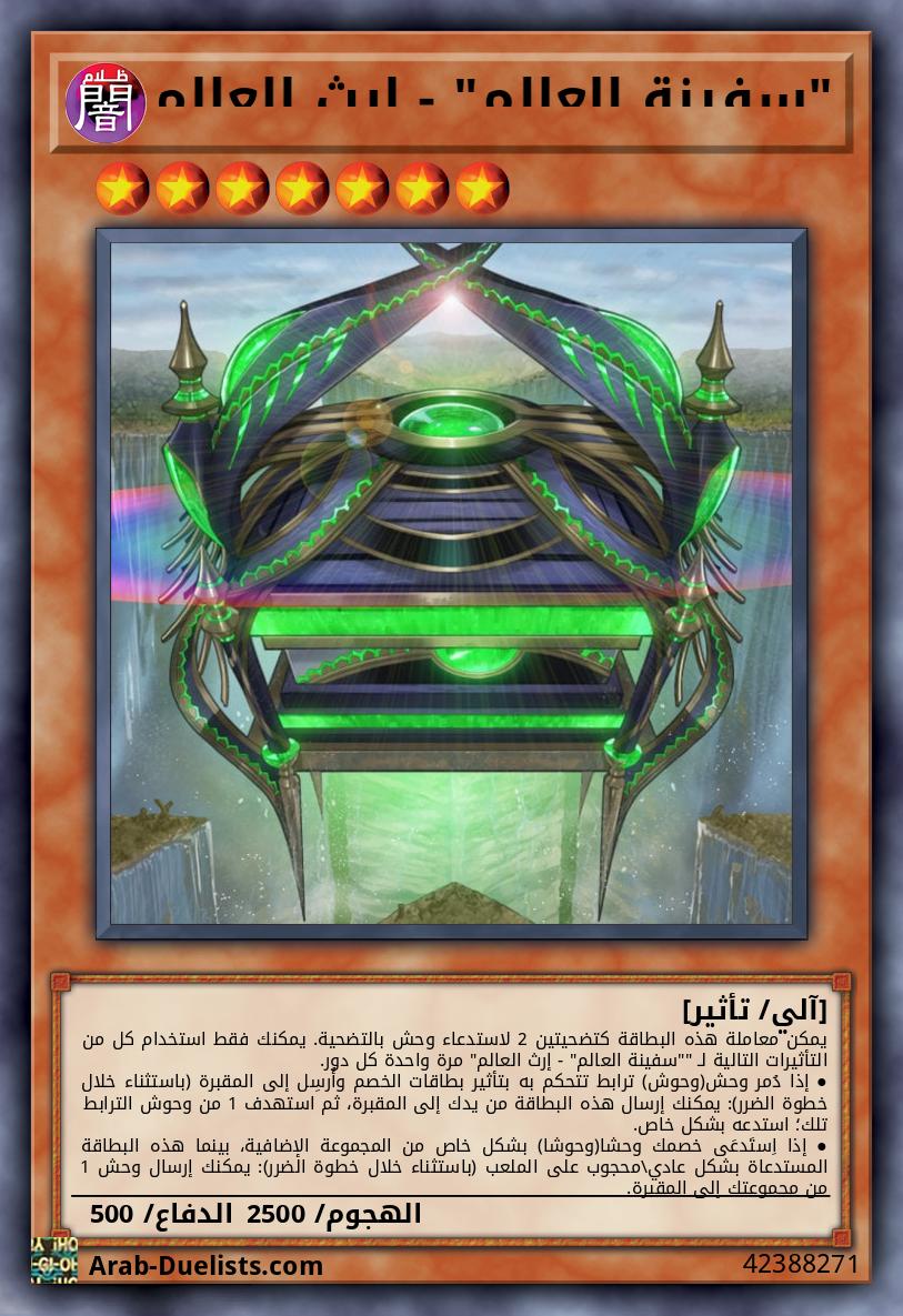 يمكن معاملة هذه البطاقة كتضحيتين 2 لاستدعاء وحش بالتضحية. يمكنك فقط استخدام كل من التأثيرات التالية لـ ""سفينة العالم" - إرث العالم" مرة واحدة كل دور. ● إذا دُمر وحش(وحوش) ترابط تتحكم به بتأثير بطاقات الخصم وأُرسِل إلى المقبرة (باستثناء خلال خطوة الضرر): يمكنك إرسال هذه البطاقة من يدك إلى المقبرة، ثم استهدف 1 من وحوش الترابط تلك؛ استدعه بشكل خاص. ● إذا اِستَدعَى خصمك وحشا(وحوشا) بشكل خاص من المجموعة الإضافية، بينما هذه البطاقة المستدعاة بشكل عادي\محجوب على الملعب (باستثناء خلال خطوة الضرر): يمكنك إرسال وحش 1 من مجموعتك إلى المقبرة.