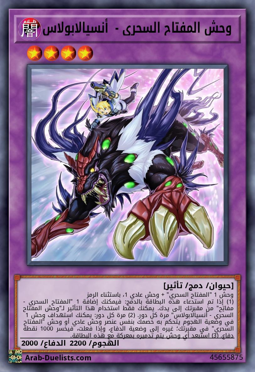 وحش 1 "المفتاح السحري" + وحش عادي 1، باستثناء الرمز (1) إذا تم استدعاء هذه البطاقة بالدمج: فيمكنك إضافة 1 "المفتاح السحري - مفاتِح" من مقبرتك إلى يدك. يمكنك فقط استخدام هذا التأثير لـ"وحش المفتاح السحري - أنسيالابولاس" مرة كل دور. (2) مرة كل دور: يمكنك استهداف وحش 1 في وضعية الهجوم يتحكم به خصمك بنفس عنصر وحش عادي أو وحش "المفتاح السحري" في مقبرتك؛ غيره إلى وضعية الدفاع، وإذا فعلت، فيخسر 1000 نقطة دفاع. (3) استبعد أي وحش يتم تدميره بمعركة مع هذه البطاقة.