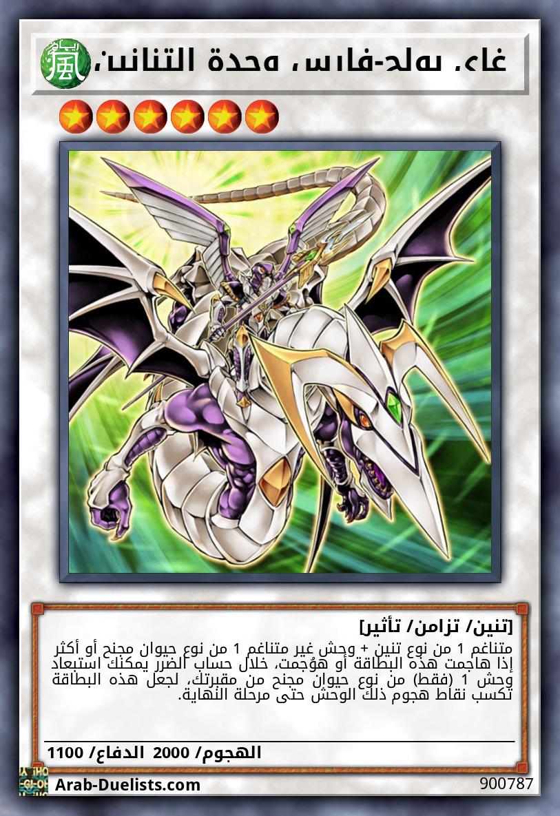 متناغم 1 من نوع تنين + وحش غير متناغم 1 من نوع حيوان مجنح أو أكثر إذا هاجمت هذه البطاقة أو هوُجمت، خلال حساب الضرر يمكنك استبعاد وحش 1 (فقط) من نوع حيوان مجنح من مقبرتك، لجعل هذه البطاقة تكسب نقاط هجوم ذلك الوحش حتى مرحلة النهاية.