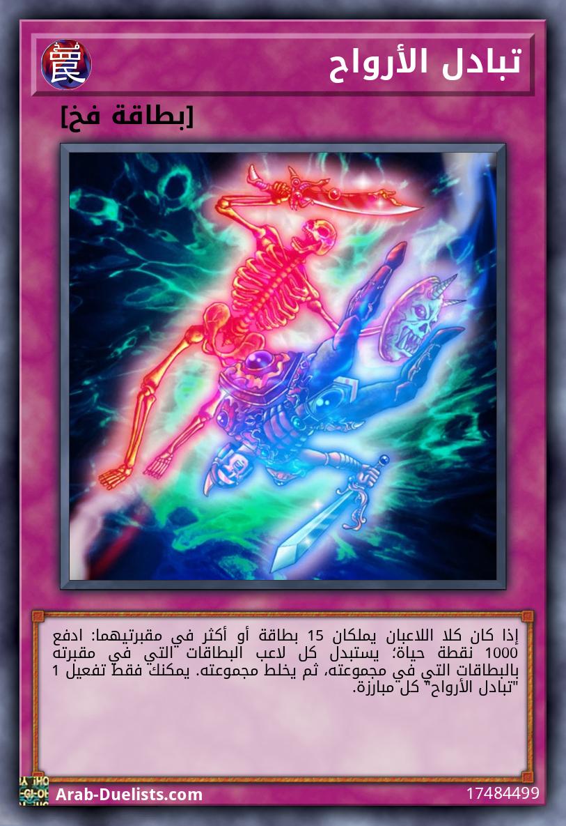 إذا كان كلا اللاعبان يملكان 15 بطاقة أو أكثر في مقبرتيهما: ادفع 1000 نقطة حياة؛ يستبدل كل لاعب البطاقات التي في مقبرته بالبطاقات التي في مجموعته، ثم يخلط مجموعته. يمكنك فقط تفعيل 1 "تبادل الأرواح" كل مبارزة. |