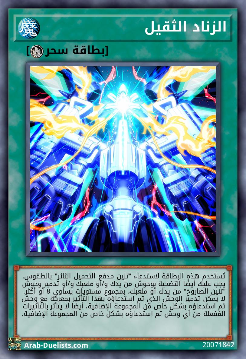 تُستخدم هذه البطاقة لاستدعاء "تنين مدفع التحميل الثائر" بالطقوس. يجب عليك أيضًا التضحية بوحوش من يدك و/أو ملعبك و/أو تدمير وحوش "تنين الصاروخ" من يدك أو ملعبك، بمجموع مستويات يساوي 8 أو أكثر. لا يمكن تدمير الوحش الذي تم استدعاؤه بهذا التأثير بمعركة مع وحش تم استدعاؤه بشكل خاص من المجموعة الإضافية، أيضا لا يتأثر بالتأثيرات المُفعلة من أي وحش تم استدعاؤه بشكل خاص من المجموعة الإضافية. |