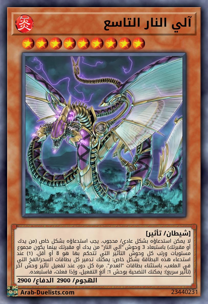 لا يمكن استدعاؤه بشكل عادي/ محجوب. يجب استدعاؤه بشكل خاص (من يدك أو مقبرتك) باستبعاد 3 وحوش "آلي النار" من يدك أو مقبرتك بينما يكون مجموع مستويات ورتب كل وحوش التأثير التي تتحكم بها هو 8 أو أقل. (1) عند استدعاء هذه البطاقة بشكل خاص: يمكنك تدمير كل بطاقات السحر/الفخ التي في الملعب، باستثناء بطاقات "العدم". مرة كل دور، عند تفعيل تأثير وحش آخر (تأثير سريع): يمكنك التضحية بوحش 1؛ ألغِ التفعيل، وإذا فعلت، فاستبعده. |
