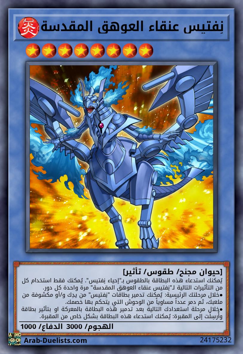 يُمكنك استدعاء هذه البطاقة بالطقوس بـ "إحياء نِفتيس". يُمكنك فقط استخدام كل من التأثيرات التالية لـ "نِفتيس عنقاء العوهق المقدسة" مرة واحدة كل دور. |
