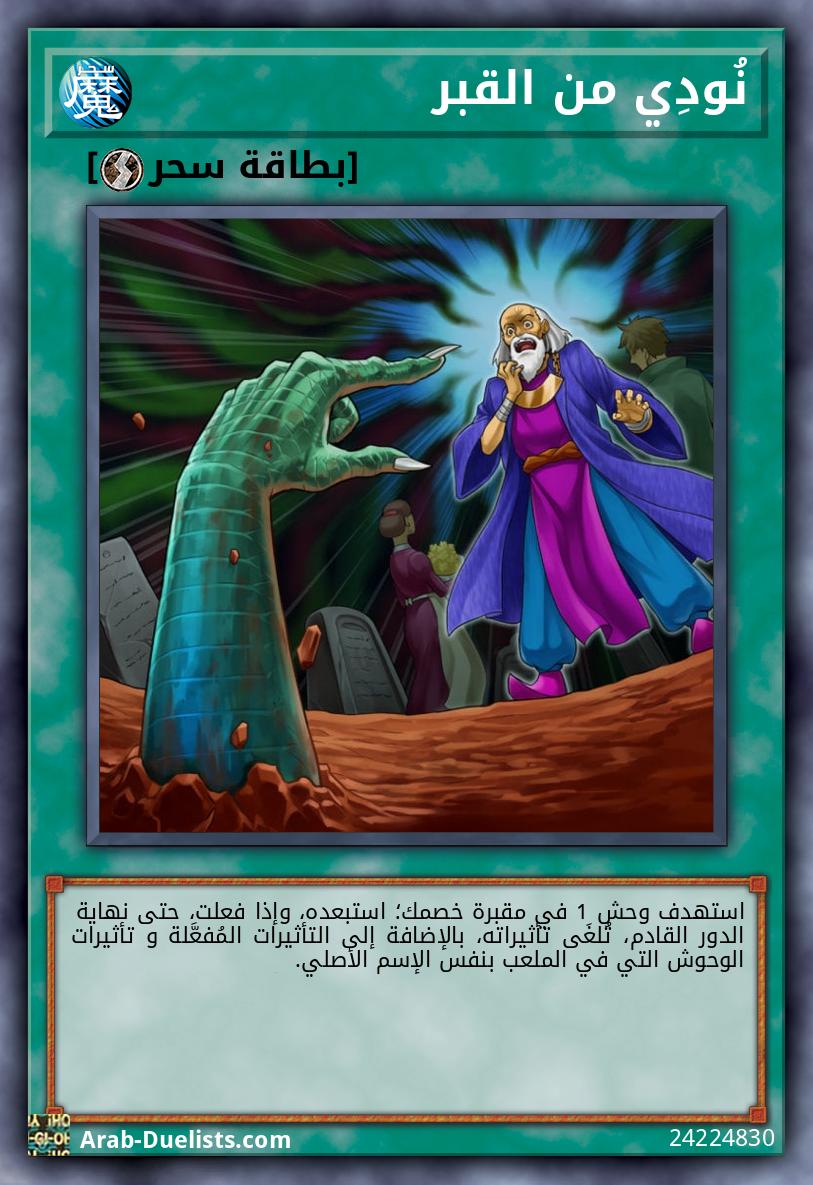 استهدف وحش 1 في مقبرة خصمك؛ استبعده، وإذا فعلت، حتى نهاية الدور القادم، تُلغَى تأثيراته، بالإضافة إلى التأثيرات المُفعَّلة و تأثيرات الوحوش التي في الملعب بنفس الإسم الأصلي. |
