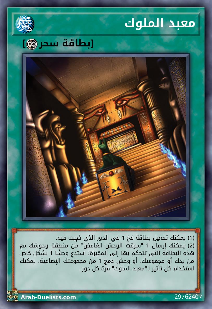 You can activate 1 Trap Card the turn it was Set. You can send 1 "Mystical Beast of Serket" in your Monster Zone and this card you control to the Graveyard; Special Summon 1 monster from your hand or Deck, or 1 Fusion Monster from your Extra Deck. You can only use each effect of "Temple of the Kings" once per turn. |
