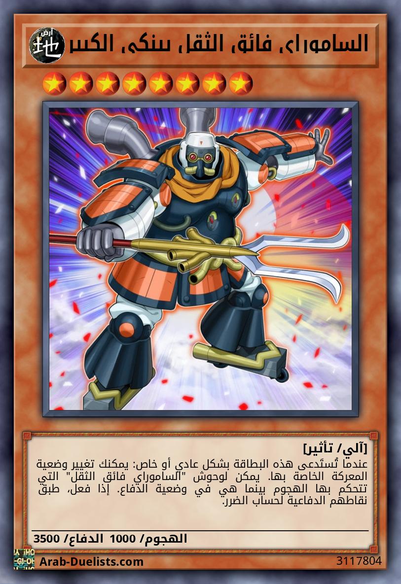 عندما تُستَدعى هذه البطاقة بشكل عادي أو خاص: يمكنك تغيير وضعية المعركة الخاصة بها. يمكن لوحوش "الساموراي فائق الثقل" التي تتحكم بها الهجوم بينما هي في وضعية الدفاع. إذا فعل، طبق نقاطهم الدفاعية لحساب الضرر. |
