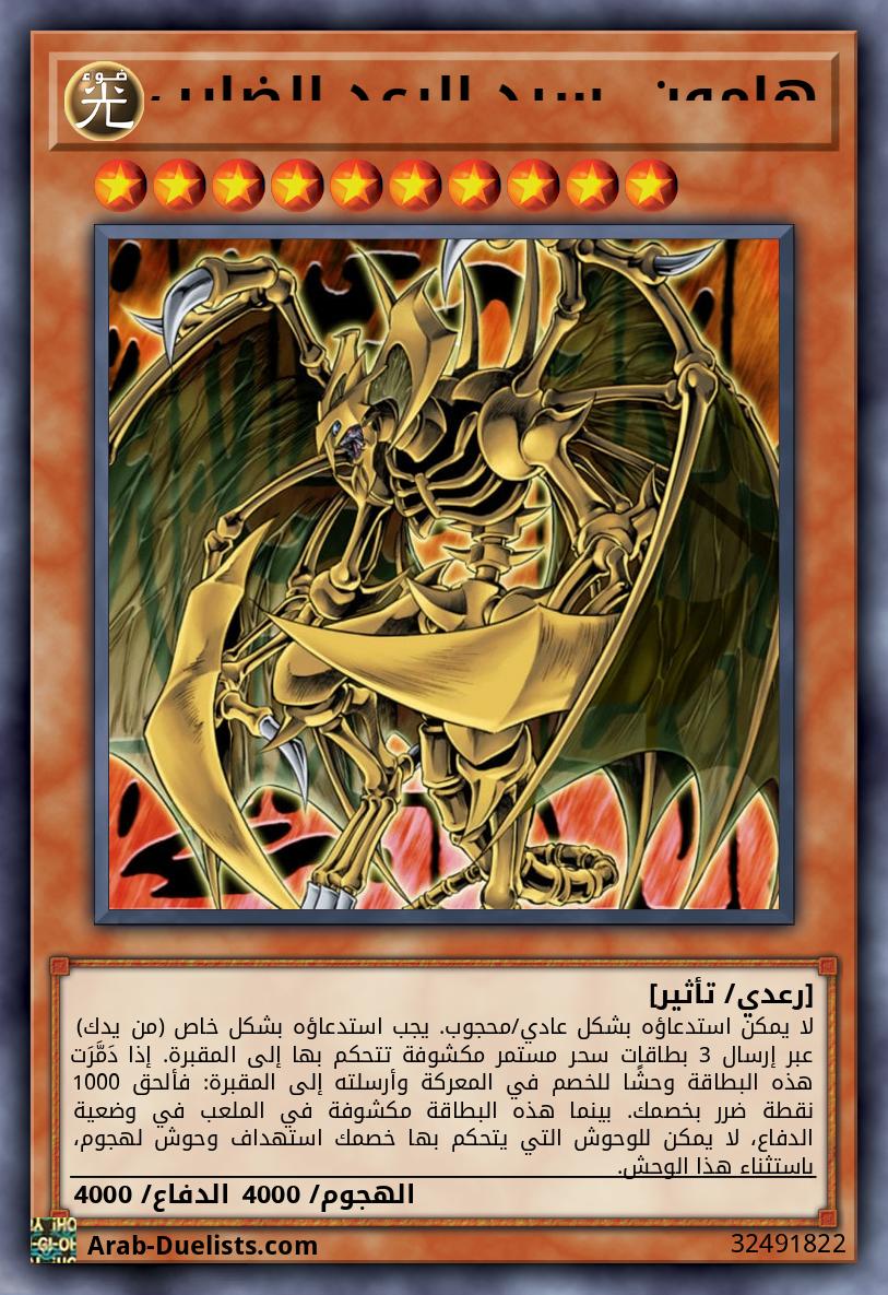 لا يمكن استدعاؤه بشكل عادي/محجوب. يجب استدعاؤه بشكل خاص (من يدك) عبر إرسال 3 بطاقات سحر مستمر مكشوفة تتحكم بها إلى المقبرة. إذا دَمَّرَت هذه البطاقة وحشًا للخصم في المعركة وأرسلته إلى المقبرة: فألحق 1000 نقطة ضرر بخصمك. بينما هذه البطاقة مكشوفة في الملعب في وضعية الدفاع، لا يمكن للوحوش التي يتحكم بها خصمك استهداف وحوش لهجوم، باستثناء هذا الوحش. |